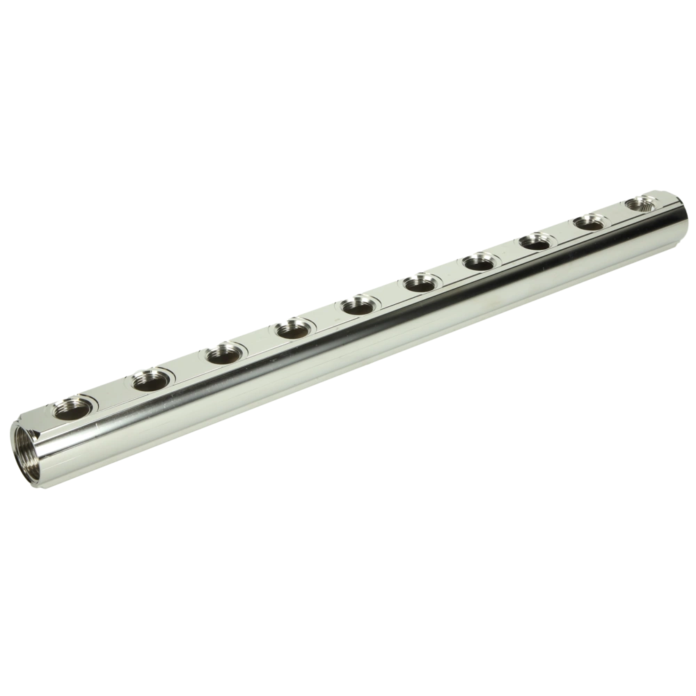 Alle ProduktinformationenMessingverteiler für den Anschluss von Kupferrohr, PEX, Polybutylen und Metallverbundrohr.