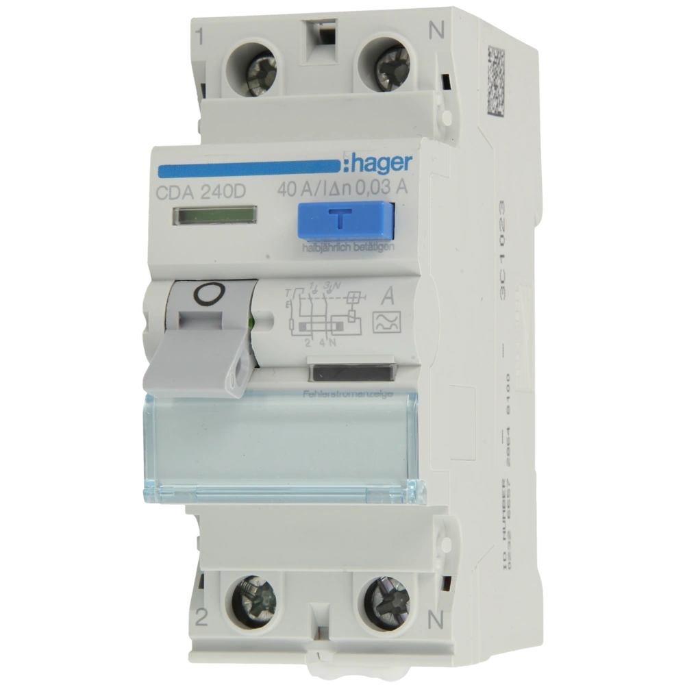 2-poliger FI-Schutzschalter des Typs A zur automatischen Abschaltung von Stromkreisen bei Überschreitung des zulässigen Fehlerstroms und zum Schutz vor lebensgefährlichen Situationen durch Isolationsfehler oder gefährliche Berührungsspannung.