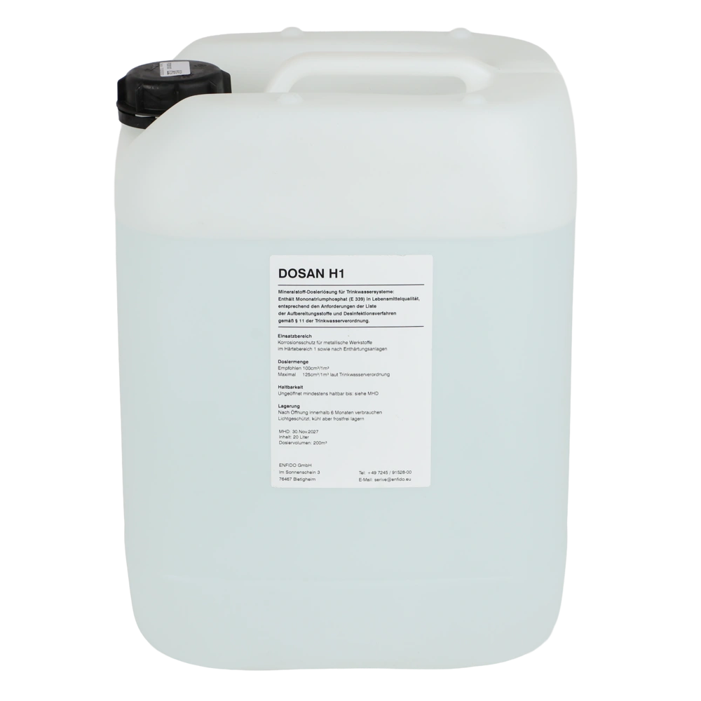 Alle ProduktinformationenFlüssige Mineralstoffkombination in Lebensmittelqualität zum Kalk- und Korrosionsschutz von Trink- und Brauchwassersystemen. Dosan H1 wird für weiches Wasser mit leicht aggressiven Eigenschaften Härtebereich 1 (1 bis 7 °dH) eingesetzt.
