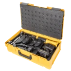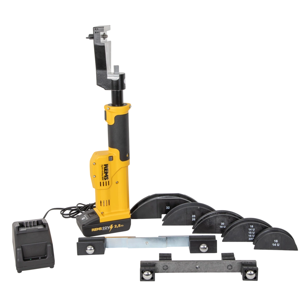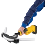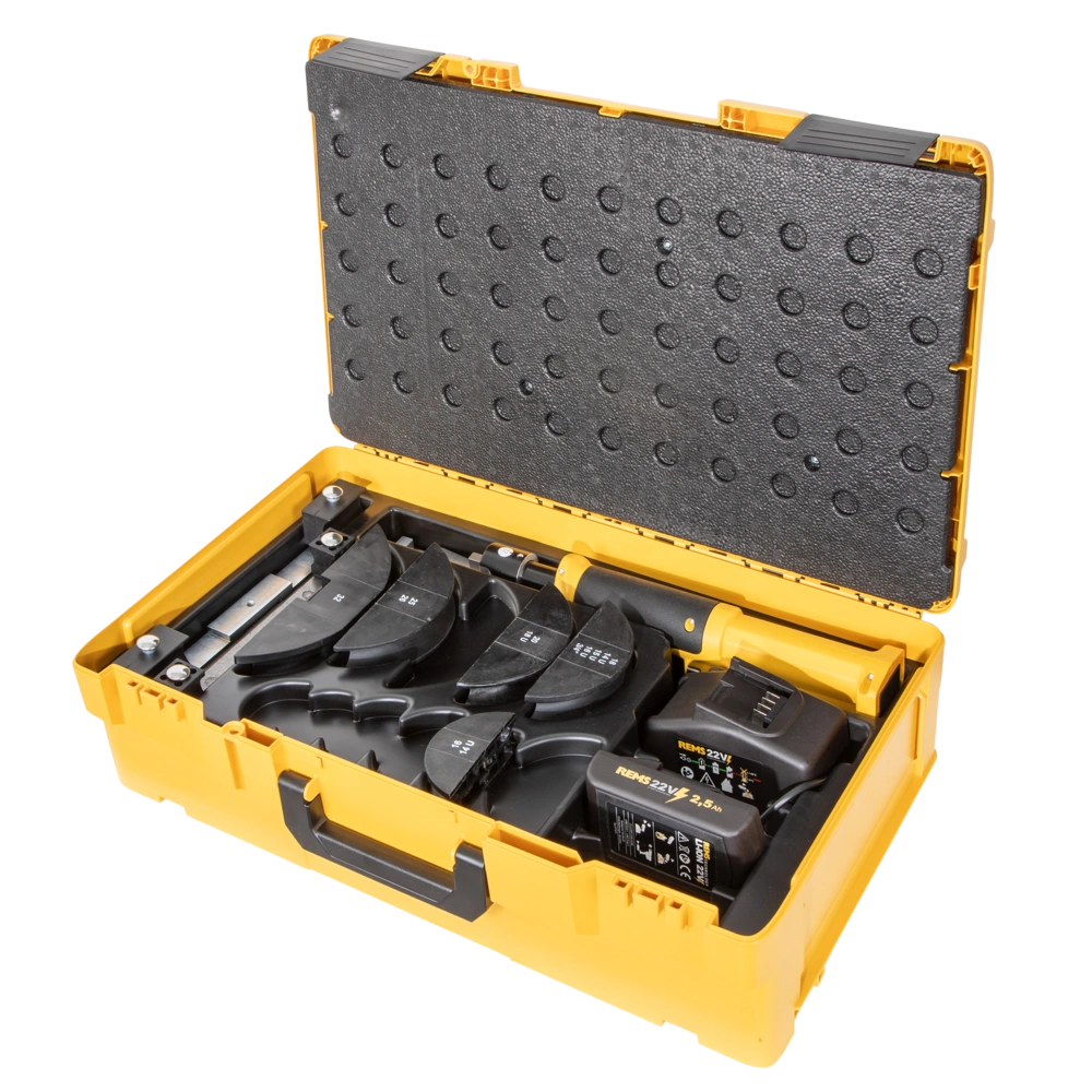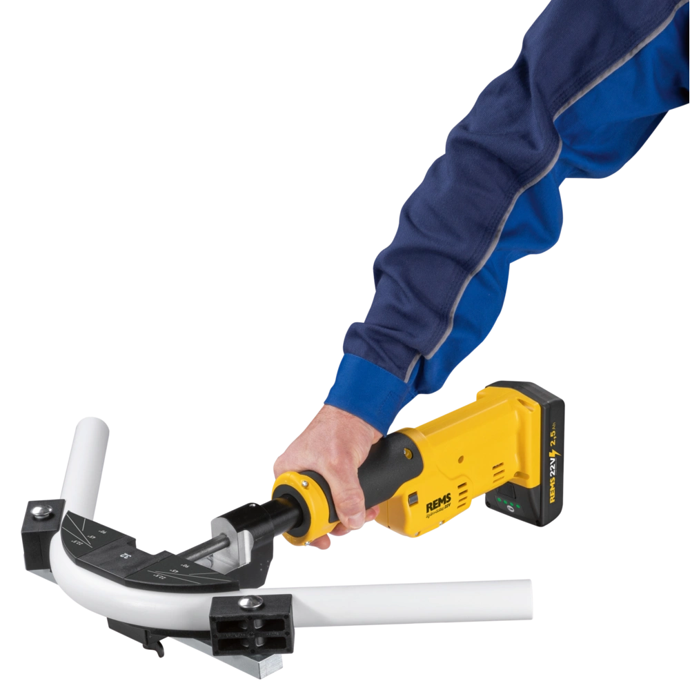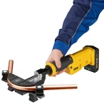 Akkubetriebener, handlicher Rohrbieger für weiche Metallrohre aus Kupfer, C- und Präzisionsstahl sowie für Rohre der Pressfitting-Systeme. Das Gerät zeichnet sich durch einen kraftvollen, elektrohydraulischen Antrieb mit leistungsstarkem Akku-Motor aus. Rohre werden in Sekunden ohne Kraftaufwand bis 90° maßgenau und faltenfrei gebogen. Auch das Biegen von Über- und Etagenbögen ist möglich. Die Biegeelemente lassen sich schnell und einfach wechseln. Eine LED-Leuchte am Gerät sorgt für eine gute Ausleuchtung des Arbeitsbereichs. Das Set wird im praktischen Systemkoffer aufbewahrt.