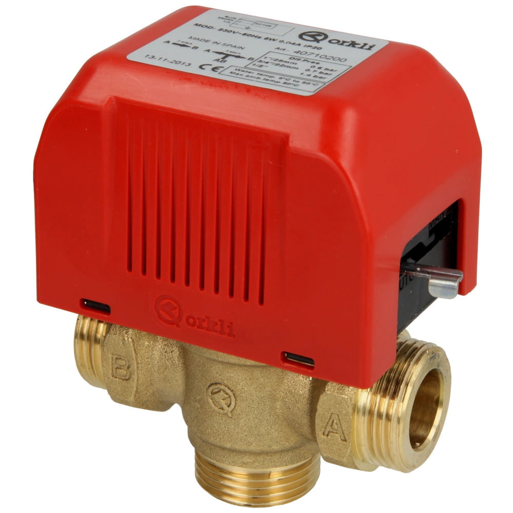 Umschaltventil für Heizungs- und Solaranlagen. Vielseitig einsetzbar zur Umlenkung eines Mediumkreislaufs. Das Ventil fährt ohne Spannung federbelastet in die Ausgangsposition zurück, es wird kein Wechselkontakt benötigt...
