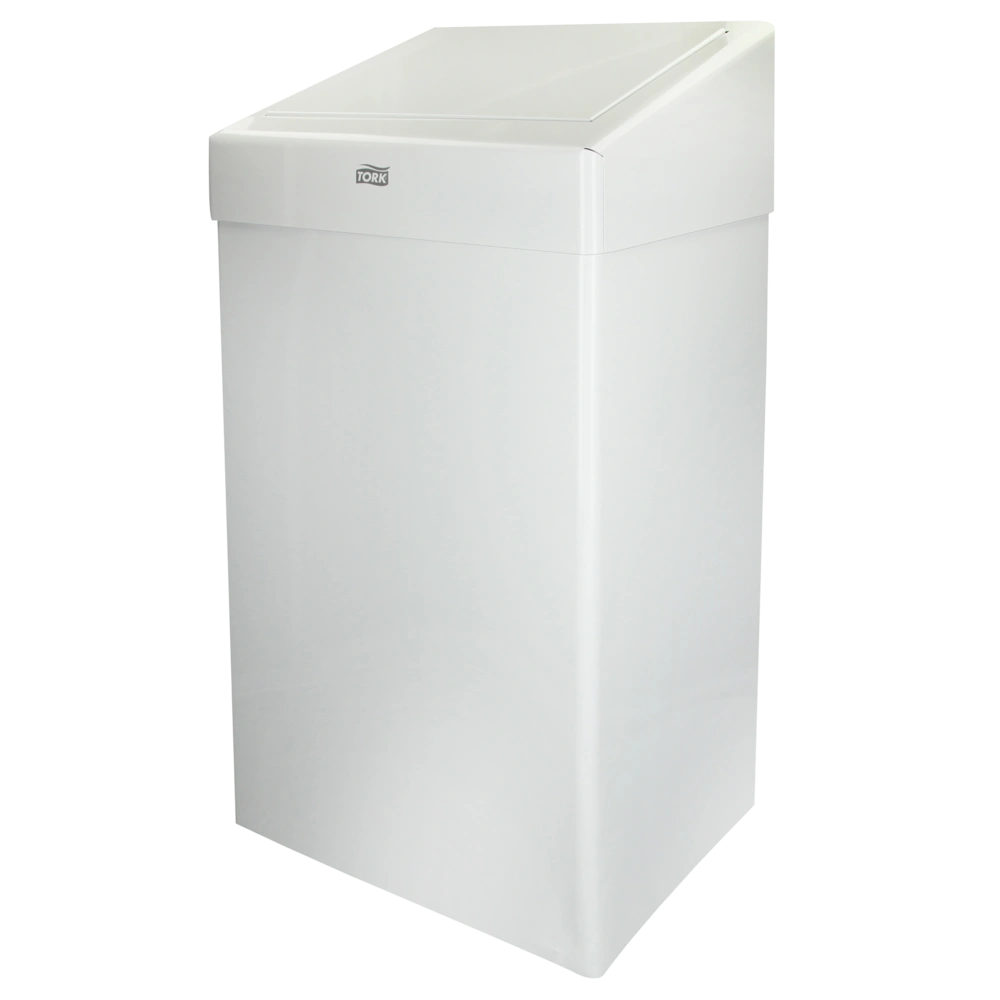 Robuster Abfallbehälter aus Metall mit handbetätigter Einwurfklappe. Der platzsparende Behälter mit großem Fassungsvermögen ist zum Aufstellen oder für die Wandmontage geeignet.