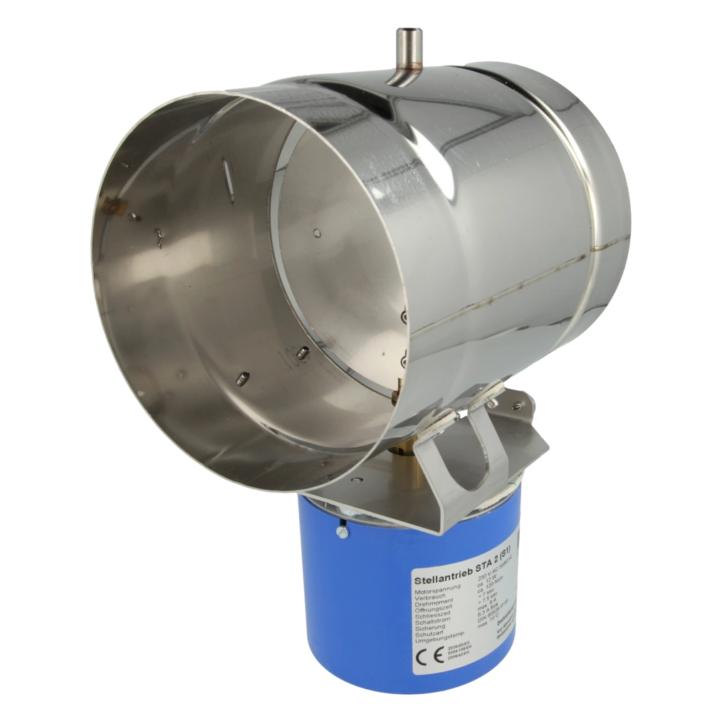 When the fireplace is not in use, the flue gas damper closes the flue gas path, preventing heated room air from escaping and the fireplace from cooling down. The motorised version can be controlled in different variations, e.g. manual control via a mains switch, temperature-dependent control via an upstream thermostat or fully automatic via a stove control system.