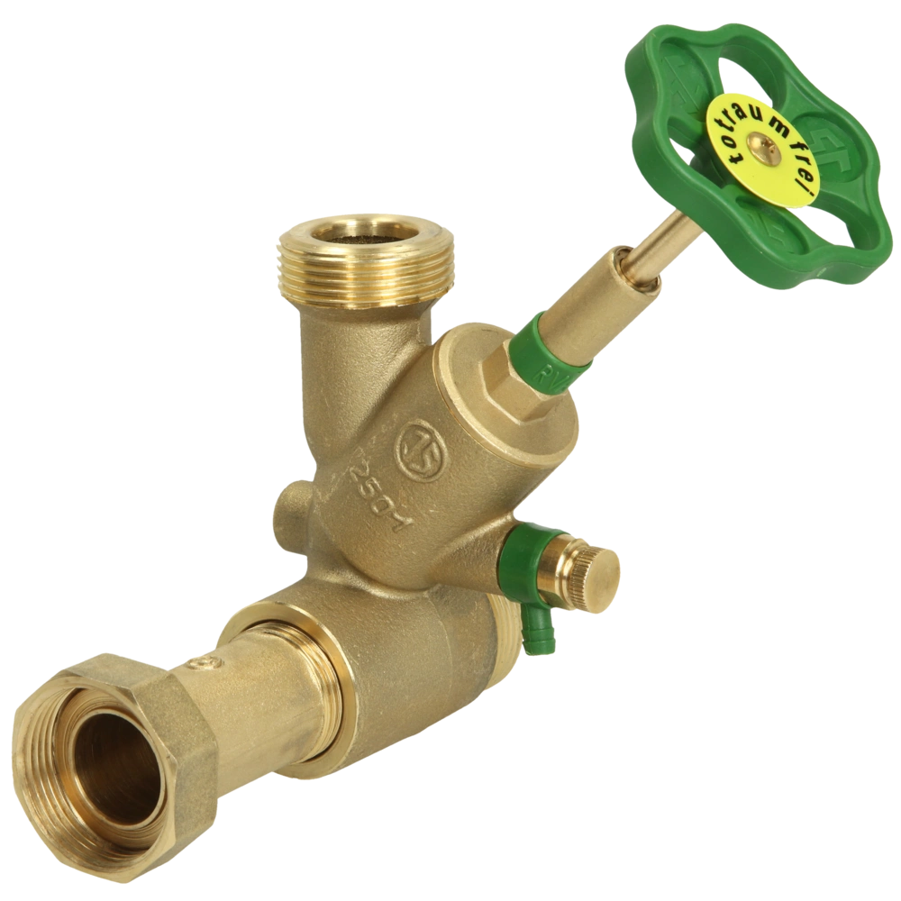Abzweig-T-Ventil aus Messing mit Entleerung. Das KFR-Oberteil ist mit einer steigenden Spindel und einem kombinierten Rückflussverhinderer ausgestattet.