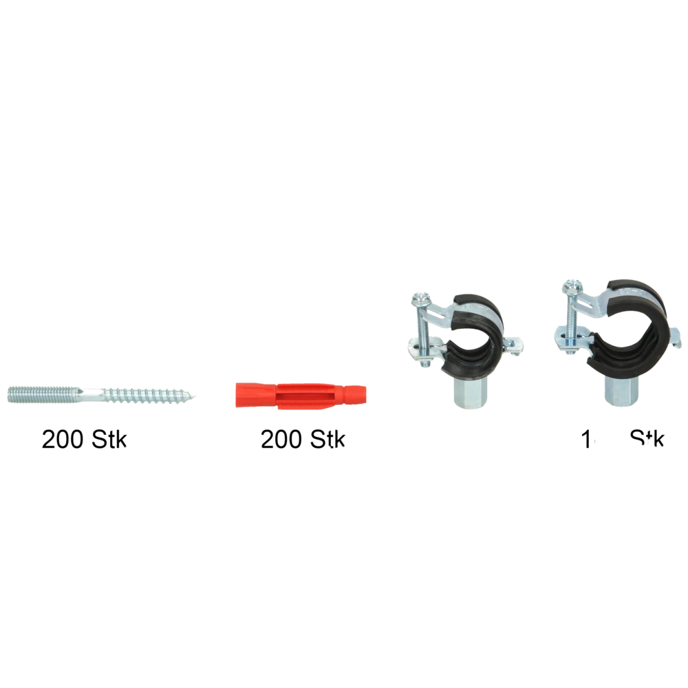 Aktionspaket mit Schellen, Stockschrauben und Dübeln für Rohre von 15 - 23 mm.