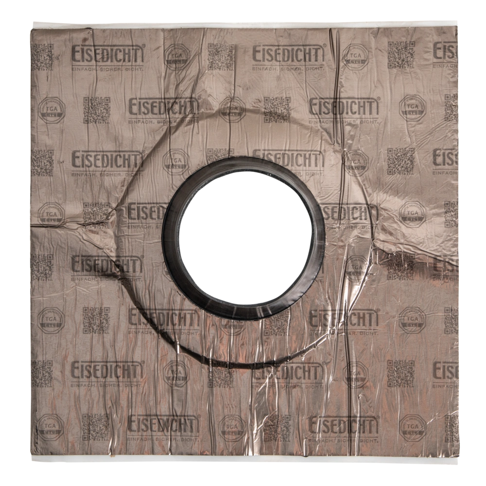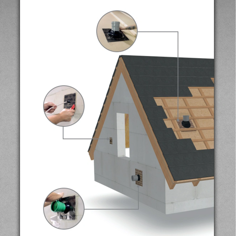 Klebemanschette zum Abdichten von Rohren zum Mauerwerk, Bodenplatten oder Holzfaserplatten. Eine elastische Tülle aus EPDM-Kautschuk und die große Klebefläche in Verbindung mit Haftprimer dichten auch auf schwierigen Untergründen dauerhaft ab...