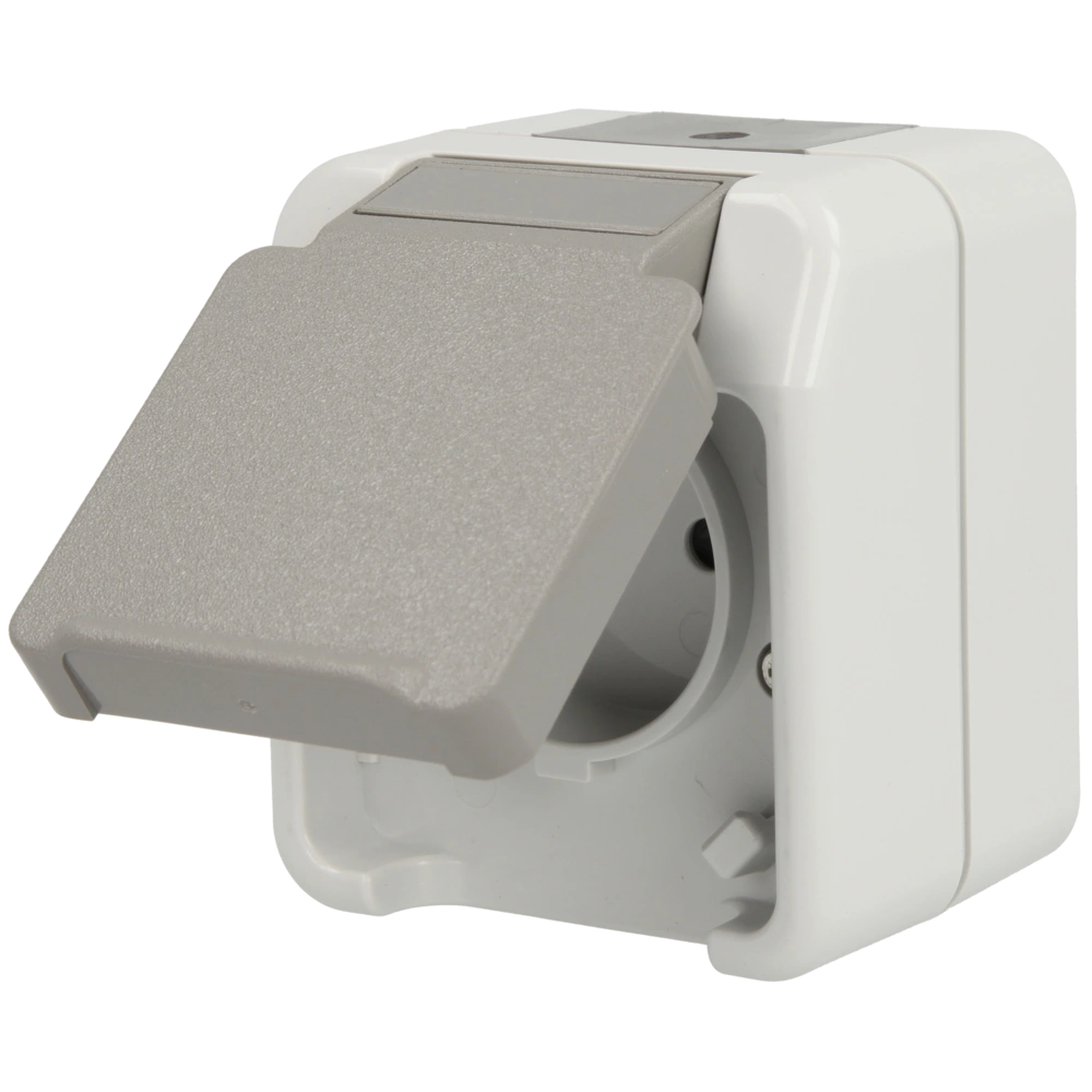 Schuko-Steckdose mit Klappdeckel und Beschriftungsfeld für die Aufputz-Installation.