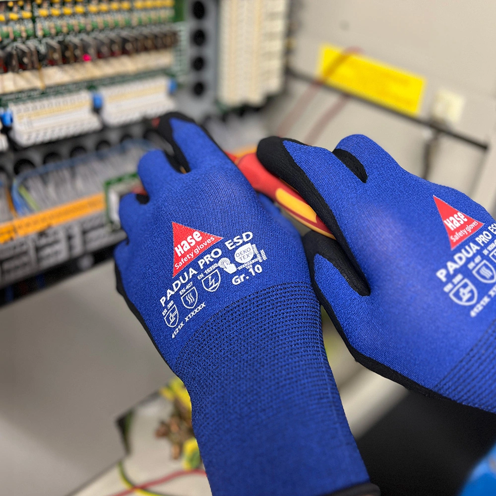 Antistatische Montagehandschuhe aus Nylon-/ Carbonfeinstrick mit sehr hohem Tragekomfort. Die Handinnenfläche und Fingerkuppen verfügen über einen Kontakthitzeschutz und Touchfunktion. Zur Bedienung eines Display muss der Handschuh nicht ausgezogen werden. Ideal für Maschinenführer, Elektro- und Wartungasarbeiten. Der Handschuh ist OEKO-TEX®-zertifiziert und daher besonders hautfreundlich.