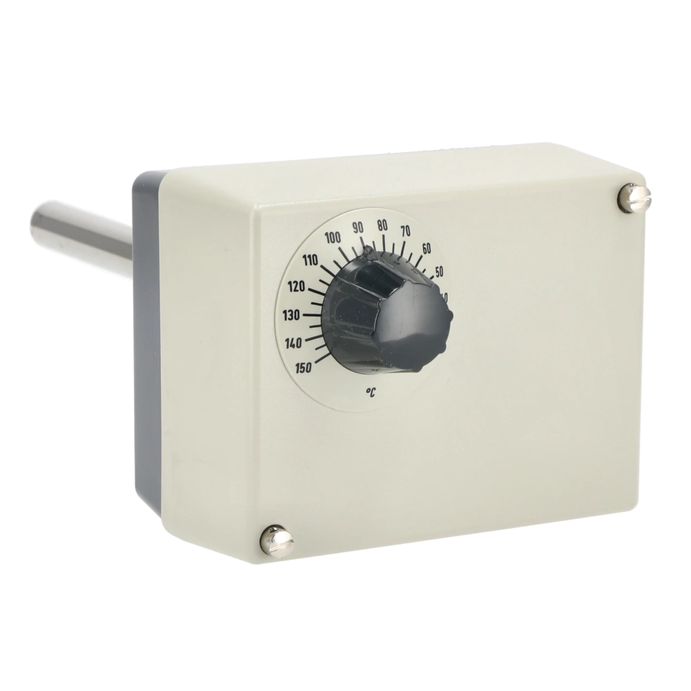 Das mechanische Aufbau-Doppelthermostat vereint Temperaturregler und Sicherheits-Temperaturwächter in einem Gerät und eignet sich für Kessel- sowie Wärmetauscherüberwachung. Zwei unabhängige Mikroschalter arbeiten nach dem Flüssigkeitsausdehnungsprinzip und ermöglichen eine klare Trennung von Regel- und Schutzfunktion. Der Regler übernimmt als automatischer 2-Punkt-Schalter mit Außeneinstellung die konstante Temperaturführung, während der Sicherheits-Temperaturwächter mit geschützter Inneneinstellung eine definierte Abschaltung auslöst und nach Unterschreiten der Ansprechtemperatur selbsttätig zurücksetzt. Durch das direkte Tauchrohr wird die Mediumtemperatur unmittelbar im Prozess erfasst, wodurch Warmwasser- und Heizkreispumpen präzise angesteuert werden. Bei Kapillarbruch öffnet der NC-Kontakt selbsttätig und bringt das System in einen sicheren Zustand.