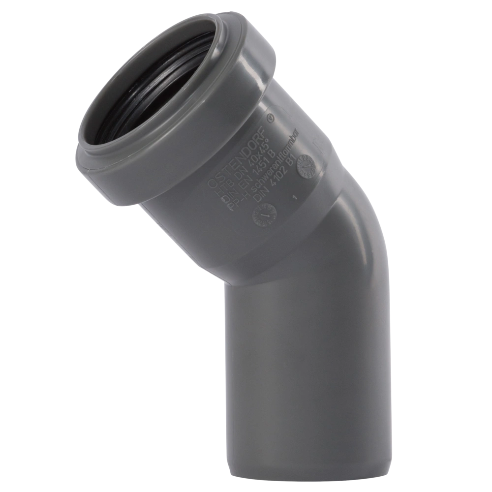 HTsafe-Rohrbogen aus schwer entflammbarem PP-H nach DIN 4102 (B1) mit einseitiger Steckmuffe und 3-fach-Dichtlippe. Eignet für die Abwasserleitung innerhalb von Gebäuden nach DIN EN 1451. Das Rohr ist für heiße, kalte und aggressive Abwässer sowie für Zentralstaubsaugeranlagen geeignet.
