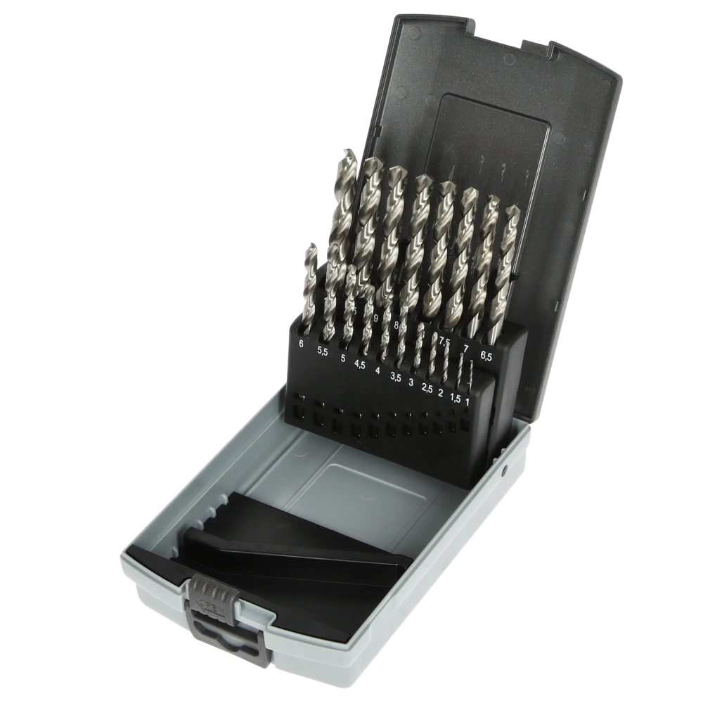 Alle Produktinformationen LieferumfangGeschliffenes Spiralbohrer HSS-G Set für den Einsatz in legiertem, unlegiertem und wärmebehandeltem Stahl sowie Aluminiumprofilen. Der Spitzenwinkel von 135° und der Kreuzanschliff ermöglichen eine präzise Selbstzentrierung, ein punktgenaues Anbohrverhalten sowie hohe Schnittgeschwindigkeiten mit geringer Wärmeentwicklung beim Bohren.