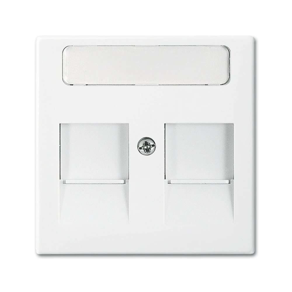 Zentralscheibe mit 2 Modular-Jack-Einsätzen inkl. Öffnungsschieber und Beschriftungsfeld als Abdeckung für Netzwerkdosen zur Unterputz-Installation.