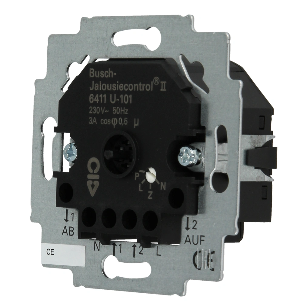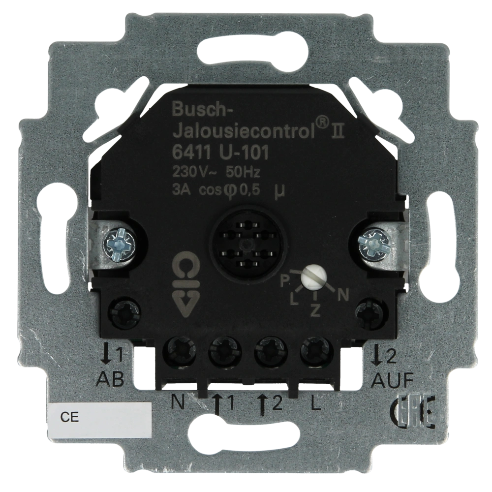 Jalousiecontrol-Einsatz für Rollladen-, Jalousie- und Markisenantriebe mit mechanischer oder elektronischer Endlagenabschaltung. Der Einsatz besitzt zwei 230 V-Nebenstelleneingänge (Auf/Ab) für die Gruppensteuerung und einen Betriebsartenschalter für die Betriebsarten Normal, Lamelle, Zentrale und Position. Über den Nebenstelleneingang ist die Aktivierung einer Windalarm- und Putz-Funktion möglich.