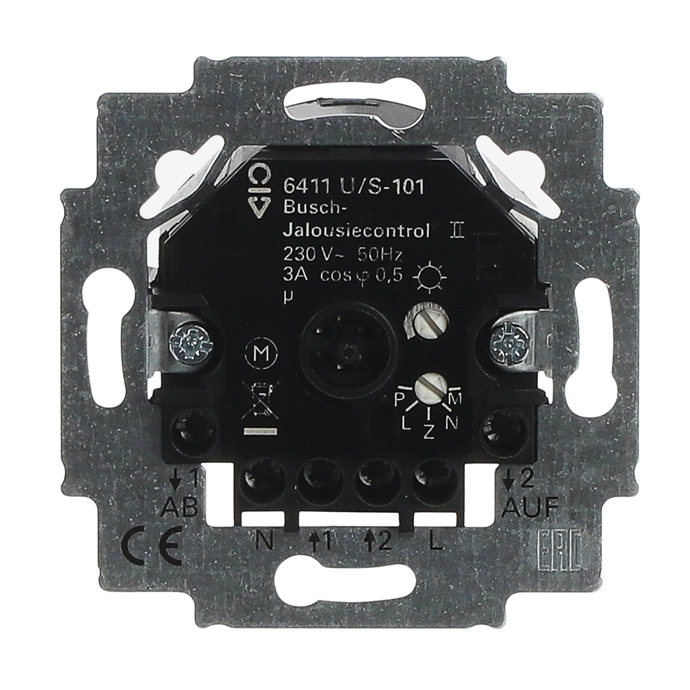 Jalousiecontrol-Einsatz für Rollladen-, Jalousie- und Markisenantriebe mit mechanischer oder elektronischer Endlagenabschaltung. Der Einsatz besitzt zwei 230 V-Nebenstelleneingänge (Auf/Ab) für die Gruppensteuerung und einen Betriebsartenschalter für die Betriebsarten Normal, Lamelle, Zentrale und Position. Über den Nebenstelleneingang ist die Aktivierung einer Windalarm- und Putz-Funktion möglich. Zusätzlich besteht die Anschlussmöglichkeit eines Helligkeitssensors und eines Glasbruchmelders.