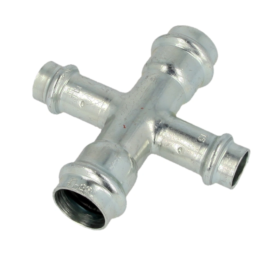 Pressfitting aus C-Stahl für Heizungs-, Druckluft-, Klima- und Solaranlagen. Zur Verpressung durch Pressbacken mit Kontur V. Unverpresst undicht durch speziellen O-Ring. Korrosionsbeständig durch galvanische Verzinkung...