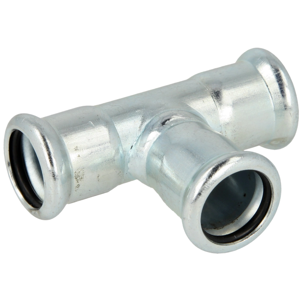 Pressfitting aus C-Stahl für geschlossene Heizungsanlagen, Klimaanlagen und ölfreie Druckluftanlagen. Zur Verpressung durch Pressbacken mit Kontur M. Unverpresst undicht durch speziellen O-Ring. Noch...
