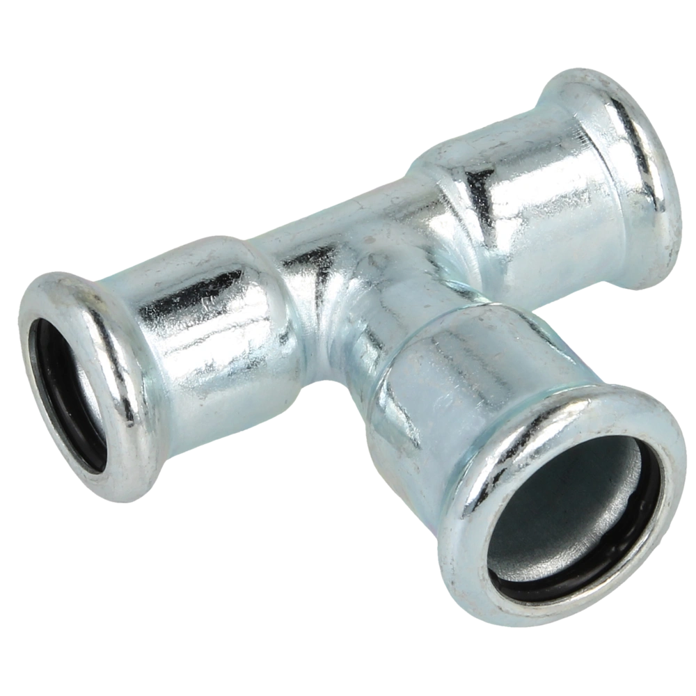 Pressfitting aus C-Stahl für geschlossene Heizungsanlagen, Klimaanlagen und ölfreie Druckluftanlagen. Zur Verpressung durch Pressbacken mit Kontur M. Unverpresst undicht durch speziellen O-Ring. Noch...