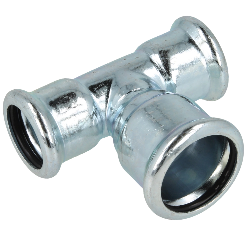 Pressfitting aus C-Stahl für geschlossene Heizungsanlagen, Klimaanlagen und ölfreie Druckluftanlagen. Zur Verpressung durch Pressbacken mit Kontur M. Unverpresst undicht durch speziellen O-Ring. Noch...