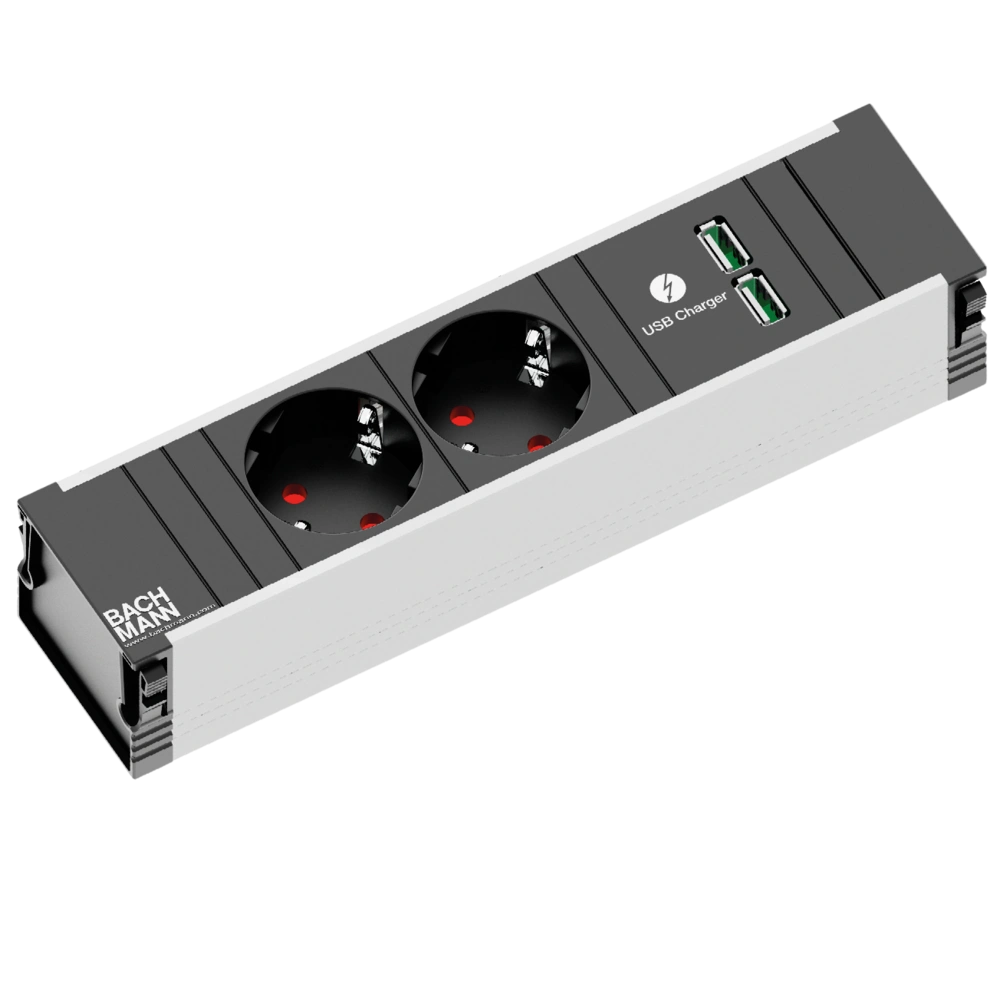 Steckdoseneinheit mit Profil aus eloxiertem Aluminium zum Einsatz in den CONI-Einbaurahmen. Die Einheit besteht aus zwei Schutzkontakt-Steckdosen mit erhöhtem Berührungsschutz und einem USB-A Doppelcharger...