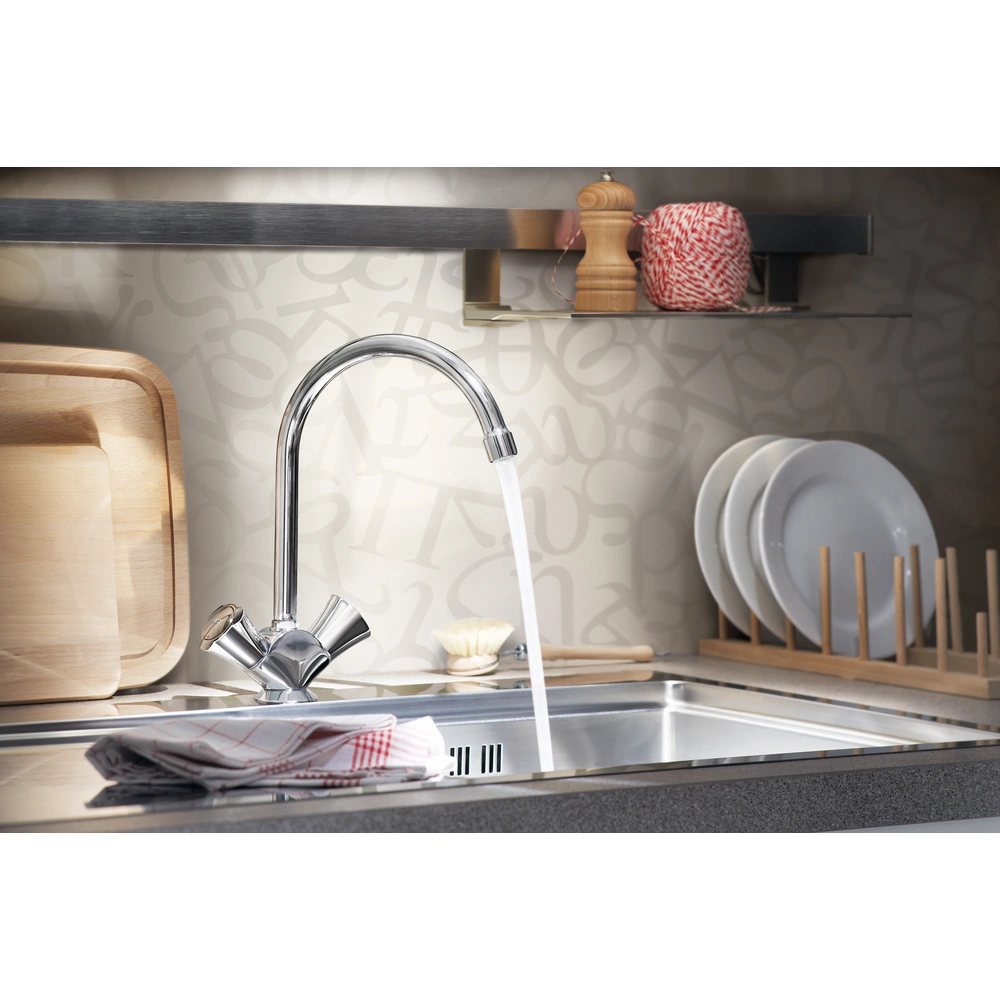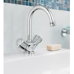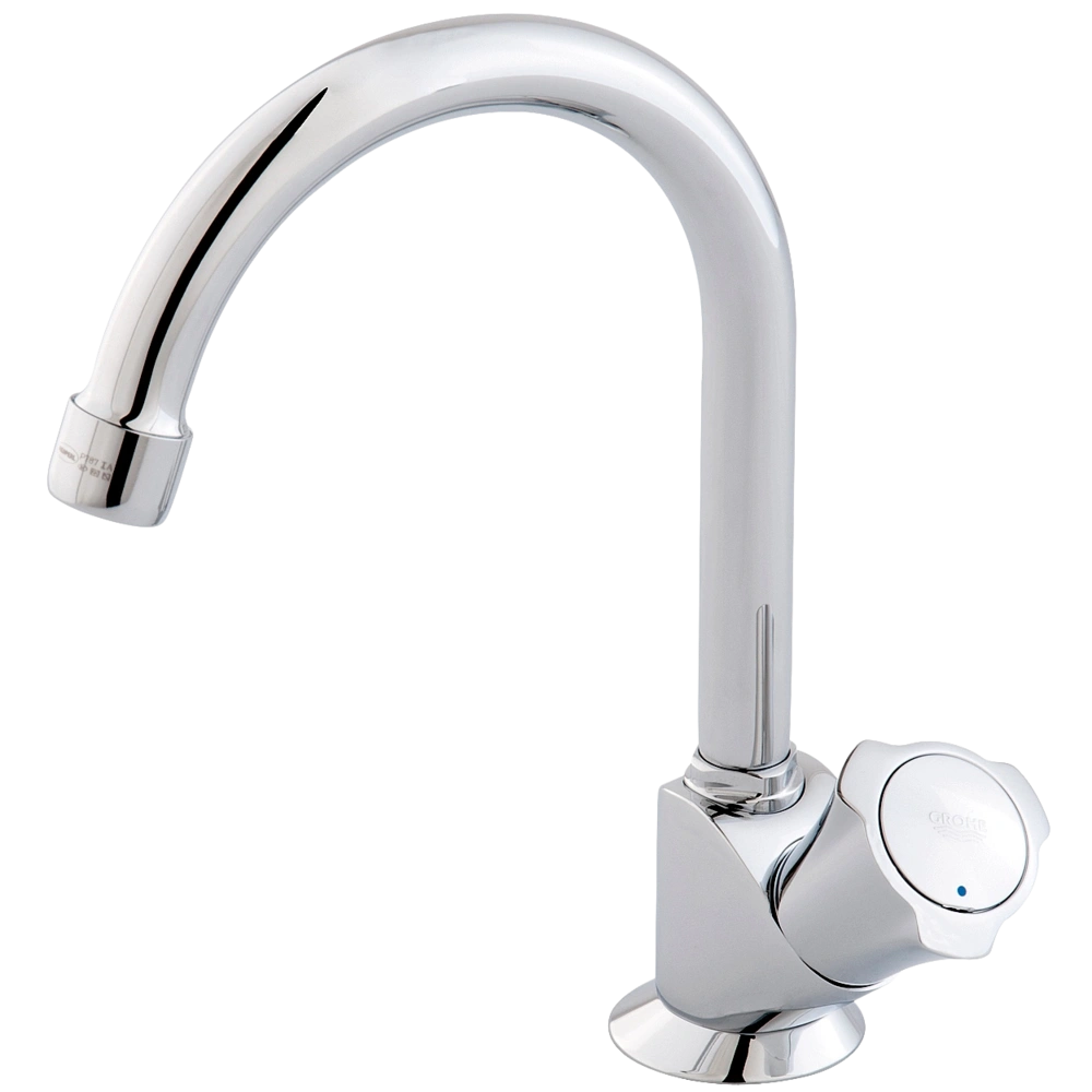 Standventil zur Einlochmontage. Es besitzt einen wärmeisolierten Metallgriff mit blauer Markierung und einen um 360° schwenkbaren Auslauf mit Mousseur. Die GROHE Long-Life® Chromoberfläche ist pflegeleicht, hygienisch und unempfindlich gegen Verkratzen.
