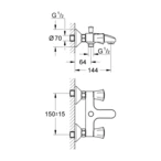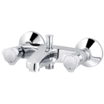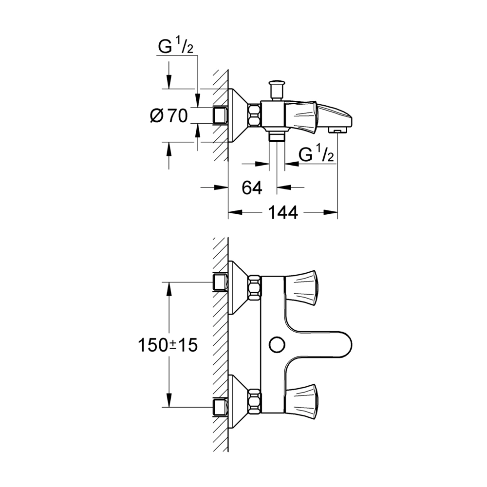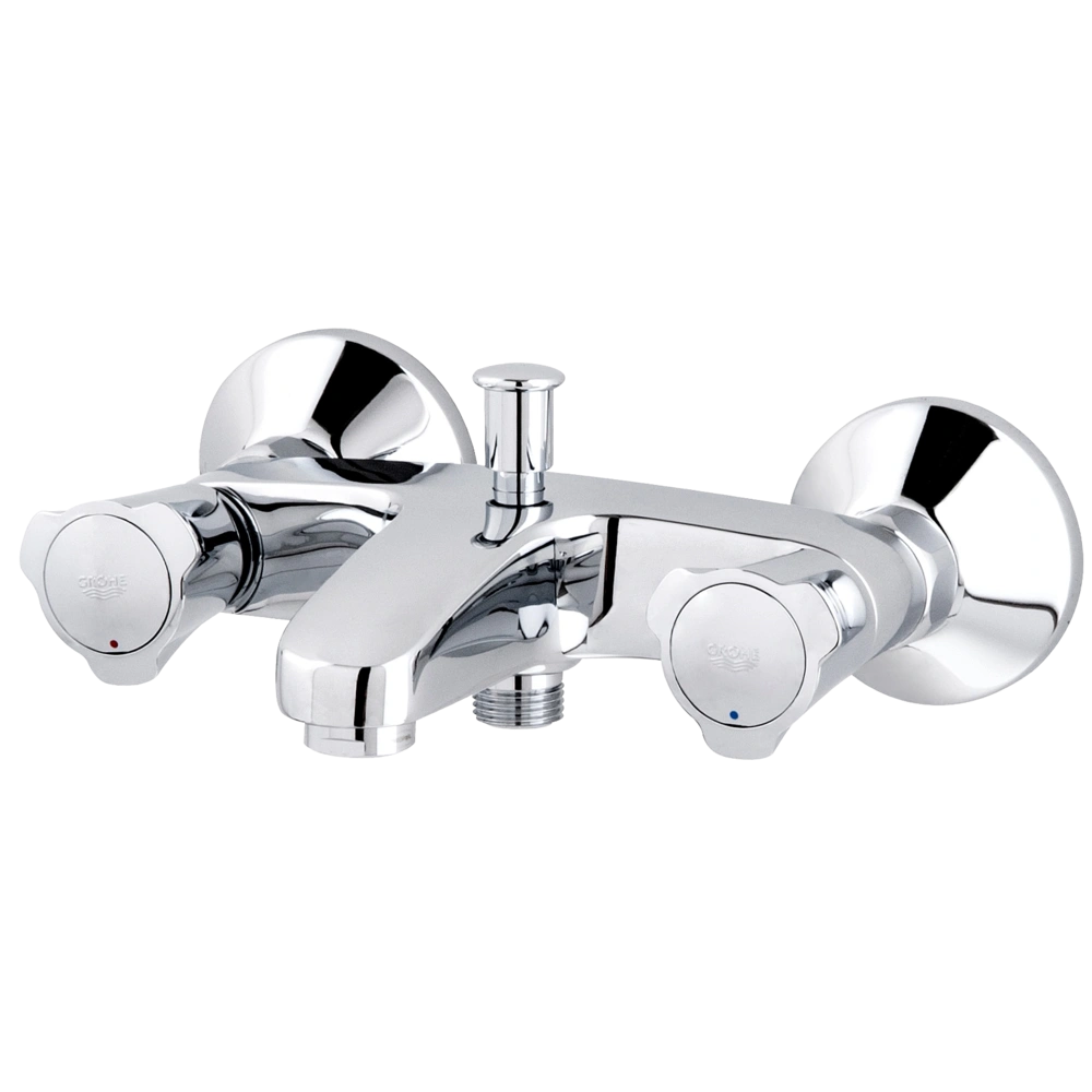 Wannenarmatur zur Aufputzmontage. Sie besitzt zwei wärmeisolierte Metallgriffe mit Markierung, einen Auslauf mit Mousseur und eine automatische Umstellung von Wanne auf Brause. Die Armatur ist mit einem Rückflussverhinderer und S-Anschlüssen ausgestattet. Die GROHE Long-Life® Chromoberfläche ist pflegeleicht, hygienisch und unempfindlich gegen Verkratzen.
