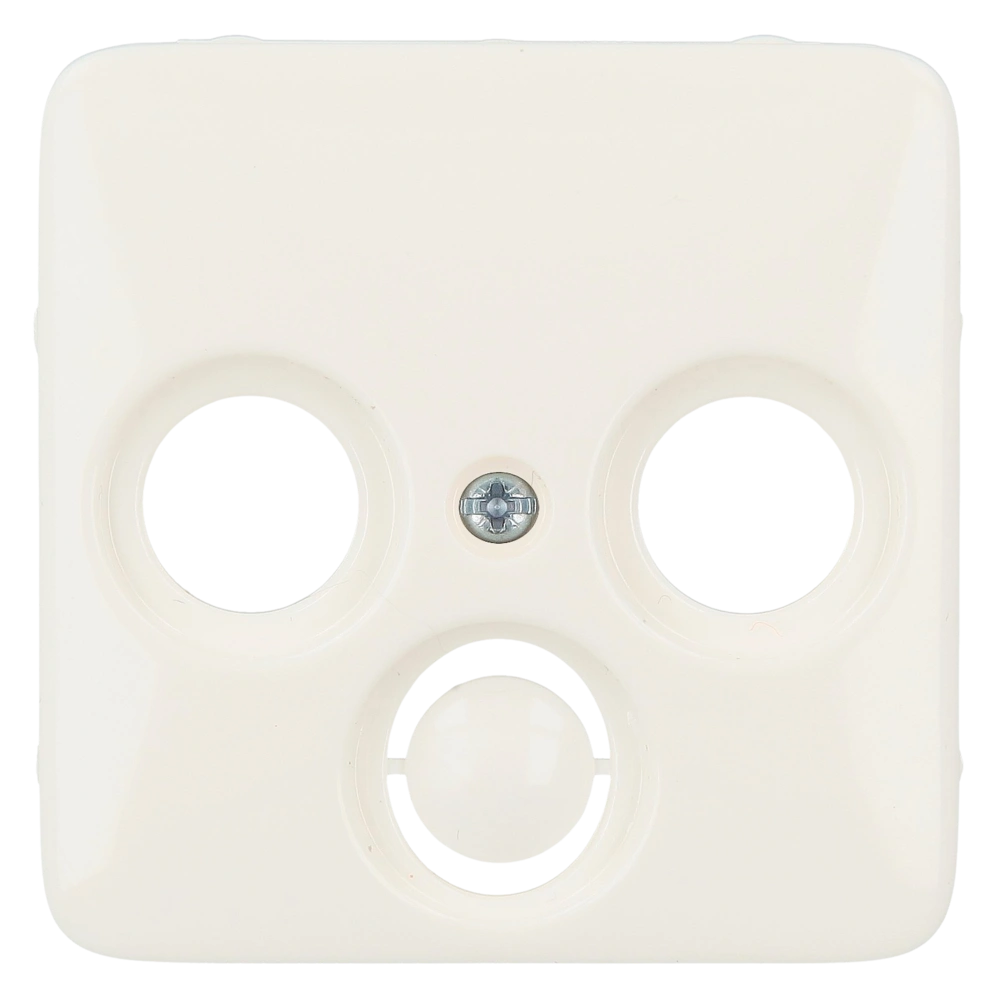 3-Loch-Abdeckung mit zentraler Befestigung für Antennensteckdosen Radio/TV/SAT zur Unterputz-Installation. Die dritte Öffnung kann bei Bedarf herausgebrochen werden.