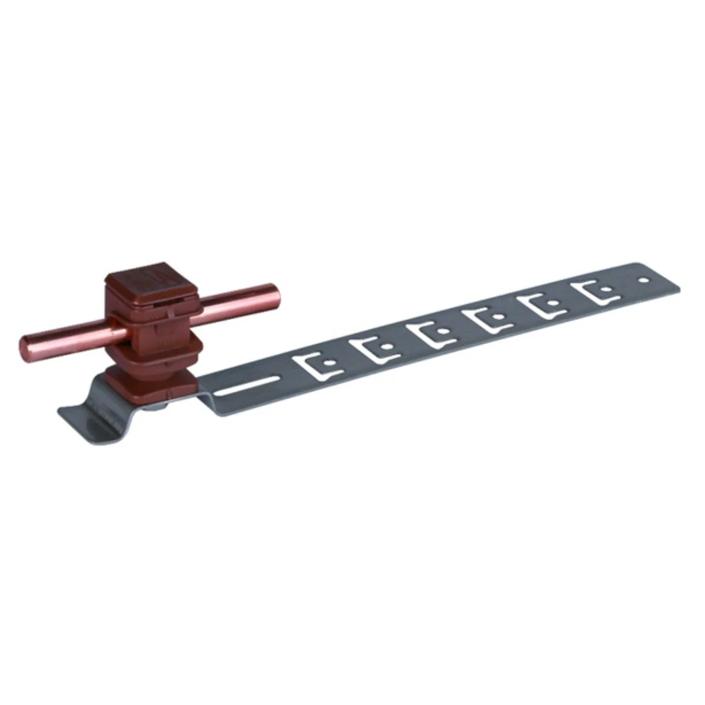 Dachleitungshalter aus NIRO mit Leitungshalter aus witterungsbeständigem Kunststoff für Fang- und Ableitungen auf Dachflächen. Der Dachhalter mit loser Leitungsführung besitzt vorgeformte Biegestellen...