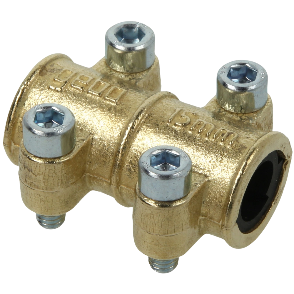 Dichtschelle aus Messing mit EPDM Dichtfläche zum schnellen Abdichten von Löchern, Rissen und porösen Stellen in wasserführenden Leitungen aus Kupfer und Edelstahl.