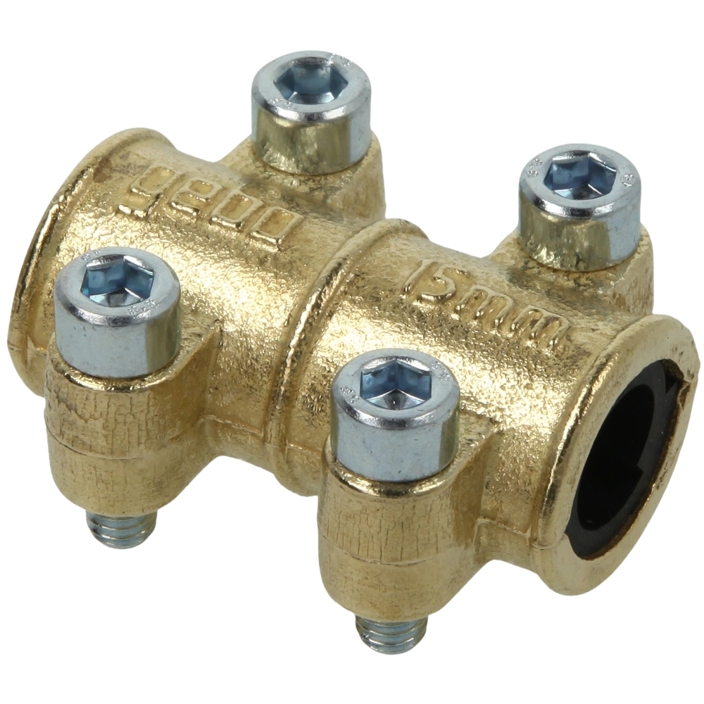 Dichtschelle aus Messing mit EPDM Dichtfläche zum schnellen Abdichten von Löchern, Rissen und porösen Stellen in wasserführenden Leitungen aus Kupfer und Edelstahl.