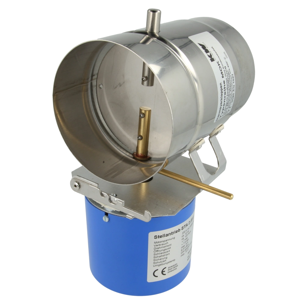 Motorische Abgasklappe mit Stellantrieb zur Steuerung der Abgasöffnung in Öl- und Gasfeuerstätten sowie Festbrennstofföfen, insbesondere in Anlagen mit Zündflamme oder Mindestöffnung für Unterdruck-Abgasanlagen. Das Gehäuse und die Klappenteile bestehen aus hochwertigem Edelstahl und die integrierte Dichtmembran ist aus EPDM gefertigt.