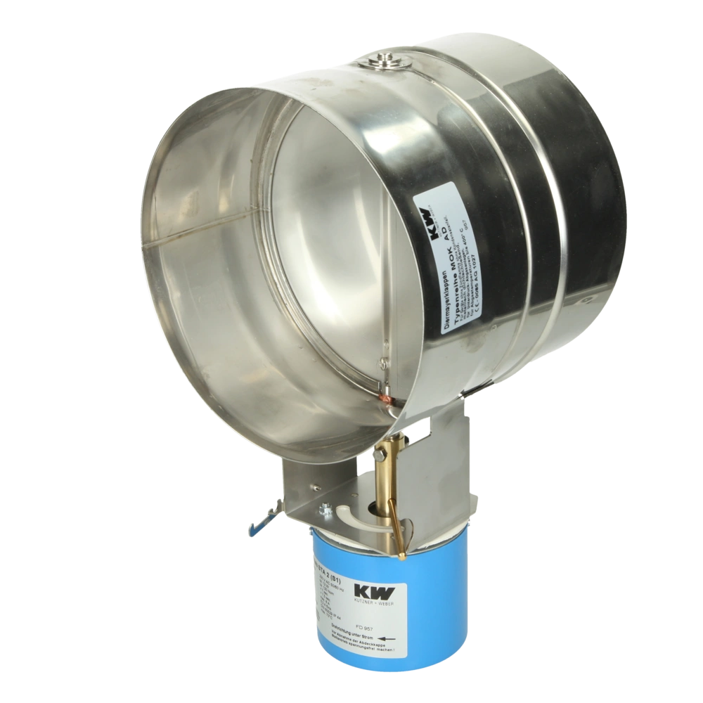 Motorische Abgasklappe MOK AD mit Stellantrieb zur Steuerung der Abgasöffnung bei Öl- und Gasfeuerstätten ohne Zündflamme und Kondensatanfall, metallisch dichtschließend für Unterdruck-Abgasanlagen. Das Gehäuse und die Klappenteile bestehen aus hochwertigem Edelstahl, und die integrierte Dichtmembran ist aus EPDM.