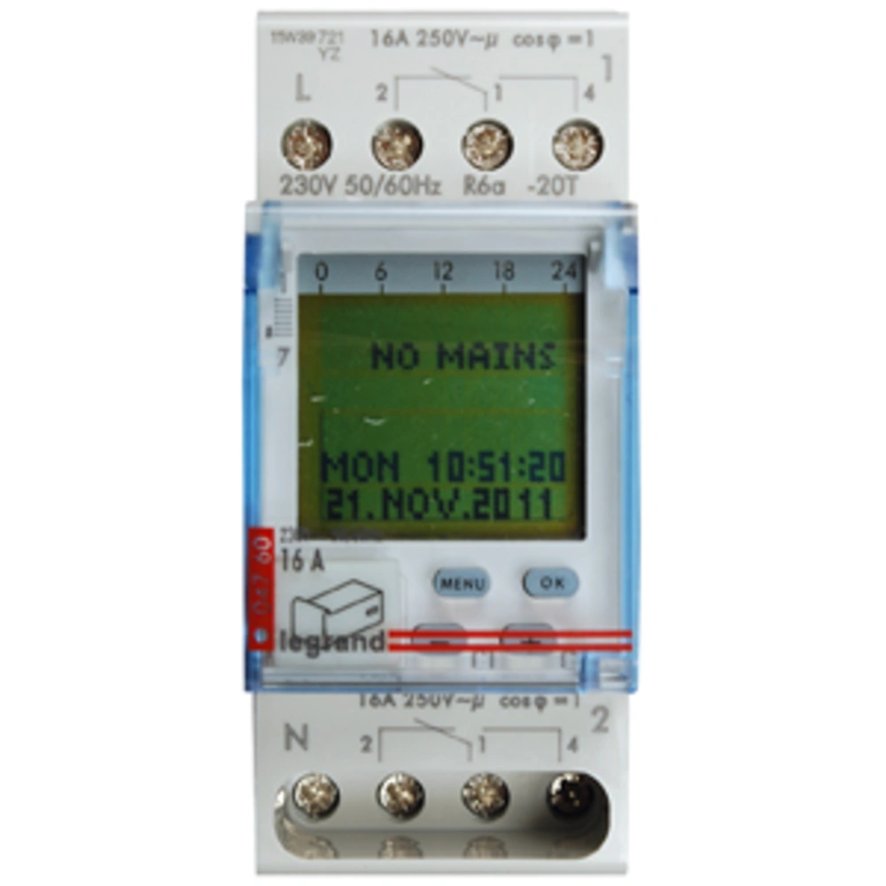 Digitale Zeitschaltuhr für die Jahres- und Wochenprogrammierung zur Montage auf einer Hutschiene.