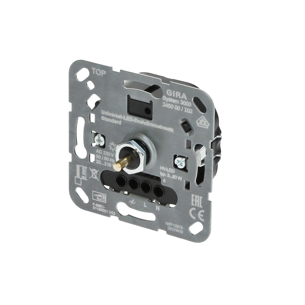 Drehdimmereinsatz zum Schalten und Dimmen von Glühlampen, HV-Halogenlampen, Trafos für Halogen- oder LED-Lampen oder Kompaktleuchtstofflampen.