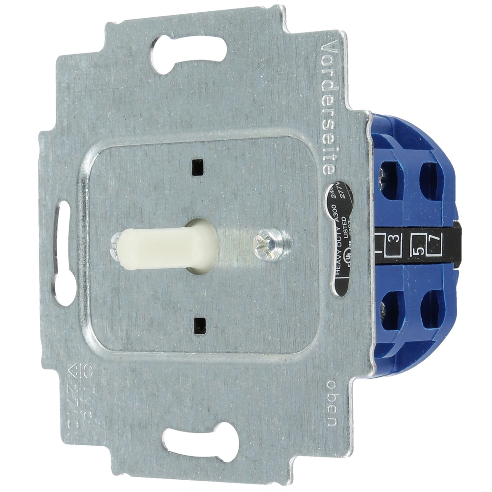 Alle Produktinformationen1-poliger Dreistufen-Drehschalter-Einsatz mit Nullstellung zur Unterputz-Installation.
