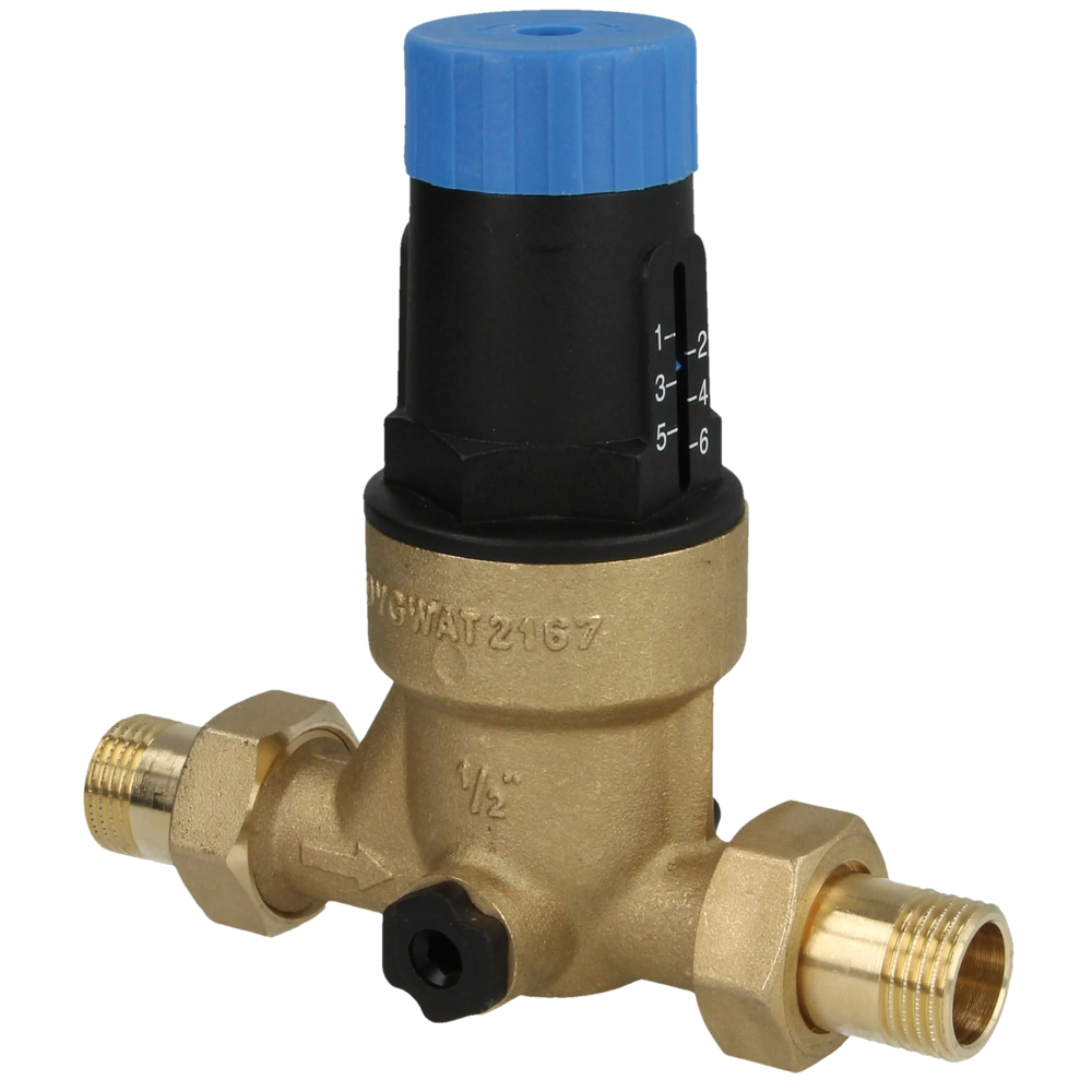 Der Druckminderer ist DVGW-zugelassen und schallschutzgeprüft (Klasse 1). Der Ausgangsdruck lässt sich von 1,5 bis 6 bar einstellen. Das Gerät hat ein sandgestrahltes Messinggehäuse, eine Federhaube aus schlagfestem Kunststoff, Membrane und O-Ringe bestehen aus NBR. Die Anzeige des Federdrucks befindet sich an beiden Seiten und es kann beim Einbau sowohl bei Flussrichtung nach links als auch bei Flussrichtung nach rechts ein Manometer auf der Vorderseite angebaut werden. Manometer nicht im Lieferumfang enthalten.