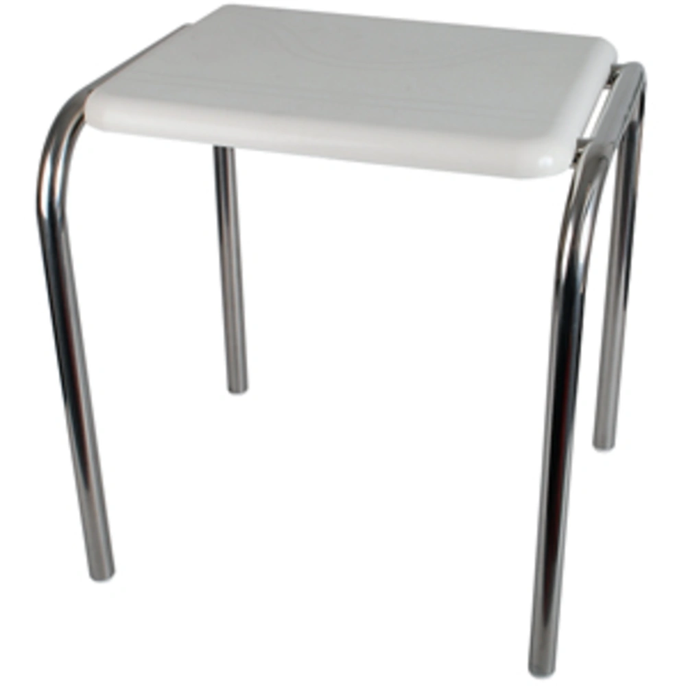 Stabiler Hocker mit Gestell aus poliertem Edelstahl für den sicheren Einsatz in Duschen von hilfs- und pflegebedürftigen Menschen. Die Sitzfläche aus weißem, hochwertigem Kunststoff ist besonders hygienisch und leicht zu reinigen...