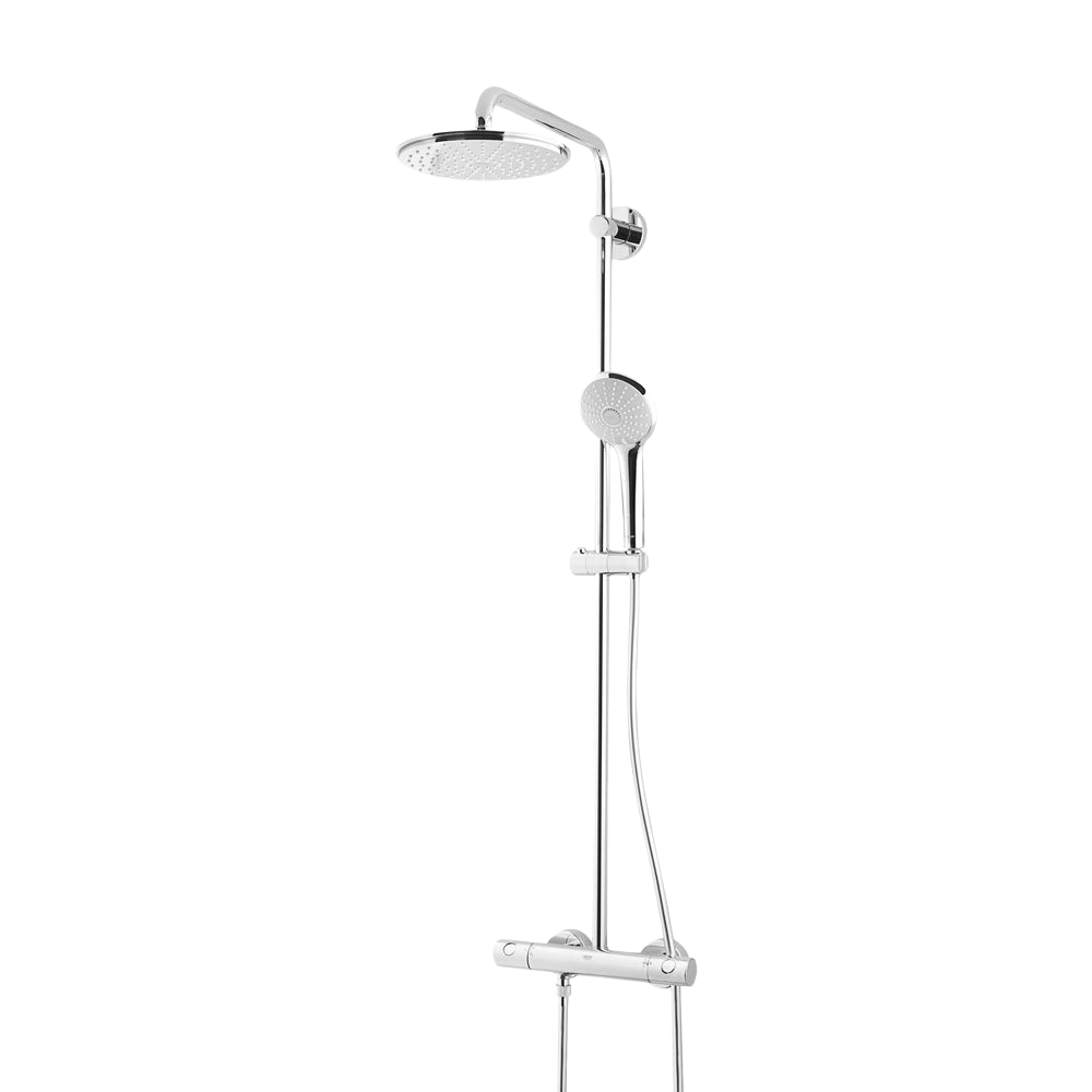 Das GROHE Euphoria Duschsystem mit Thermostatbatterie ist für die Aufputz-Wandmontage geeignet. Es verfügt über einen horizontal schwenkbarem Duscharm mit 15° drehbarer Kopfbrause und eine Handbrause, die durch das Gleitelement in der Höhe verstellbar ist. Das Thermostat verfügt über die Safe Stop Plus Funktion und die Aquadimmer Funktion. Mit dem GROHE SpeedClean wird Kalk in den Silikondüsen durch einfachen Wischen entfernt und die GROHE StarLight® Oberfläche sorgt für eine makellose, lang anhaltende Oberfläche, die besonders widerstandsfähig ist gegen Schmutz und Kratzer. Die Schläuche sind mit GROHE TwistFree ausgestattet. Das Duschsystem ist für die Verwendung mit einem Durchlauferhitzer ab 18 kW/h geeignet.