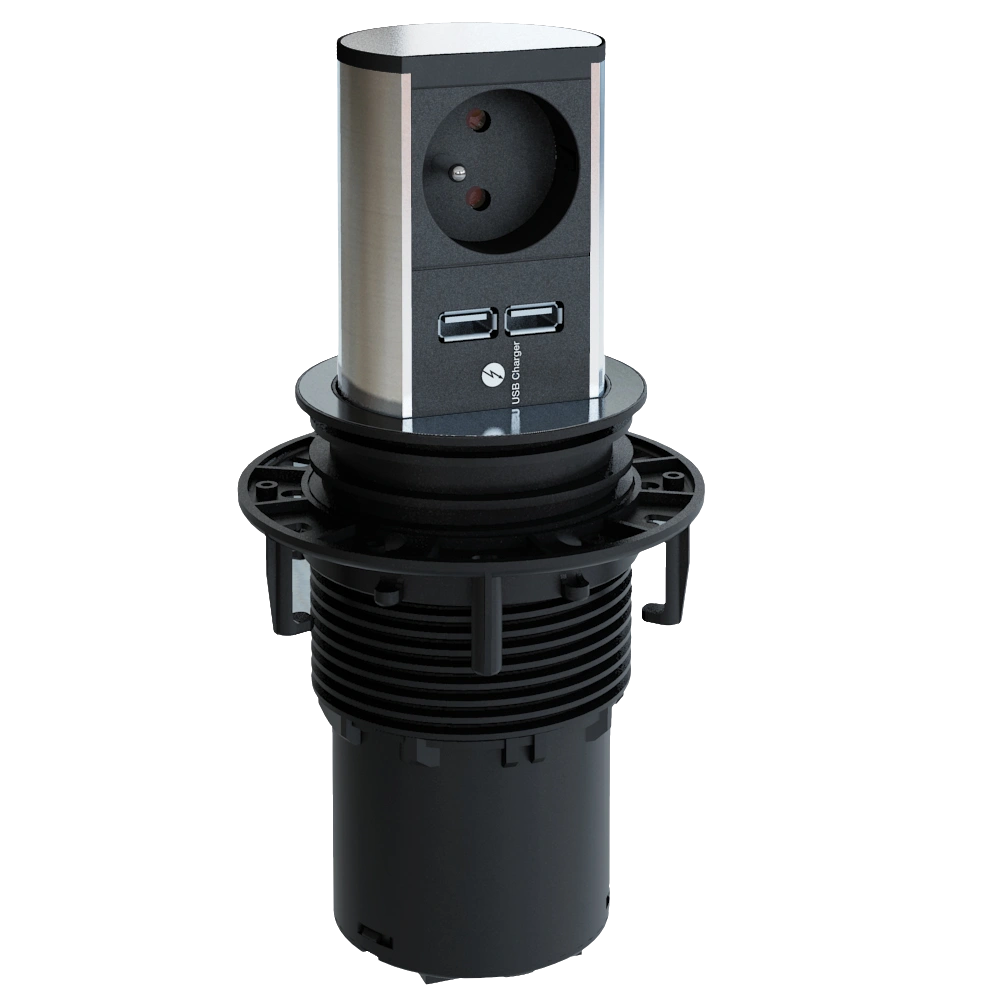Alle ProduktinformationenVersenkbare Steckdoseneinheit mit Profil aus Aluminium in Edelstahloptik zum einfachen Einbau in Tischplatten. Die Einheit besteht aus einer UTE-Steckdose mit erhöhtem Berührungsschutz und einem USB-A Doppelcharger. Sie lässt sich per Fingerdruck ausfahren und ebenso leicht wieder einschieben.