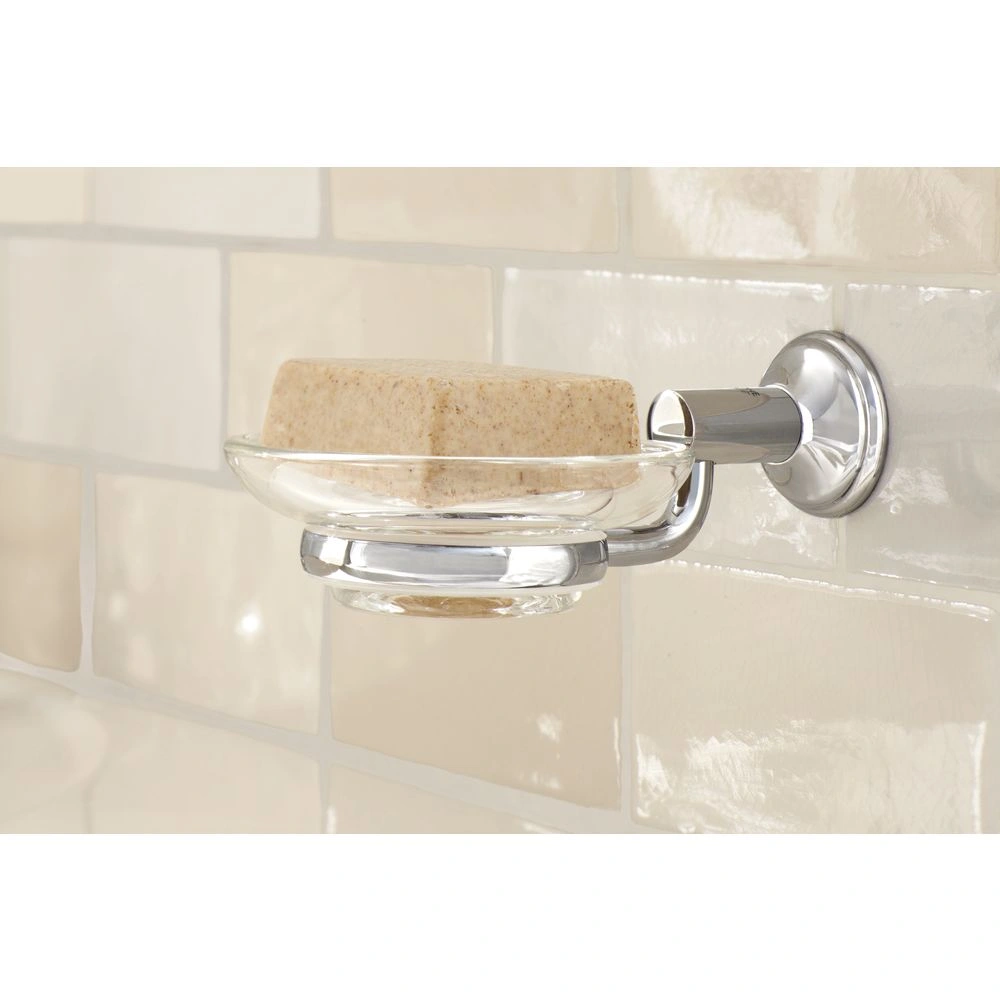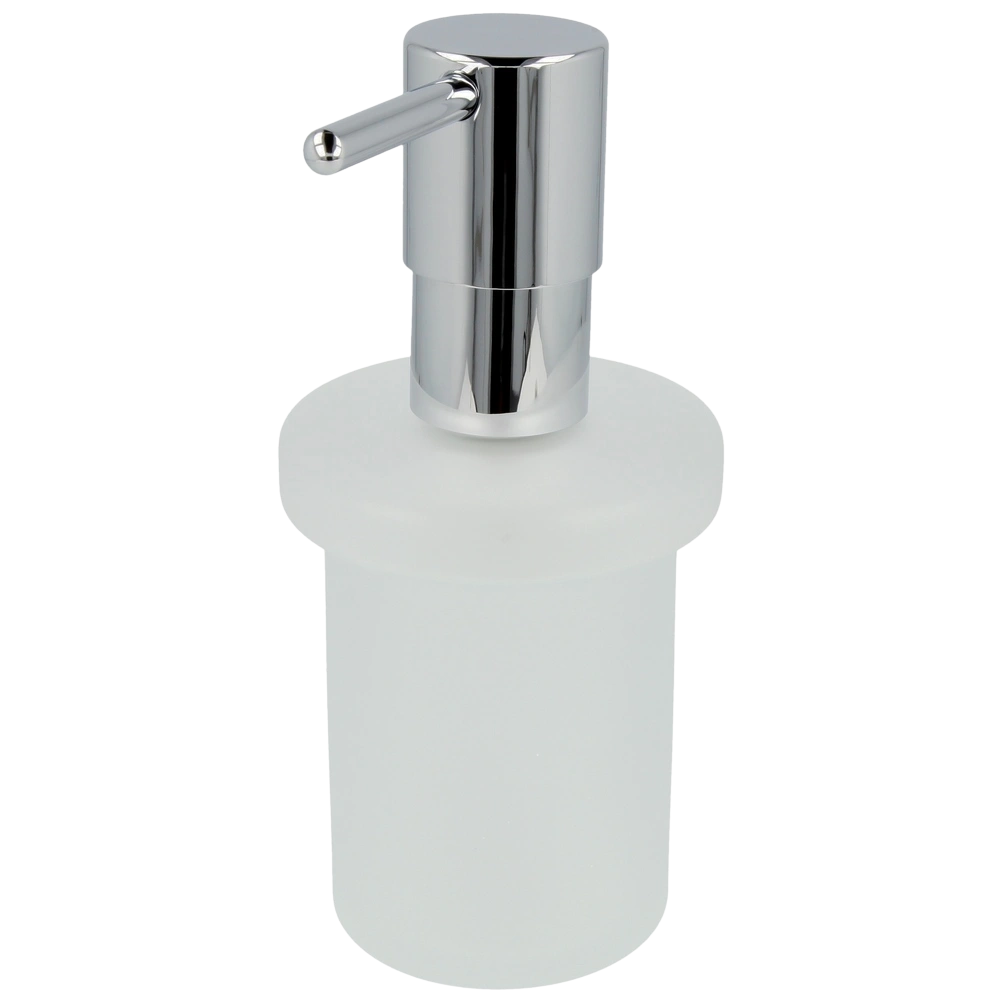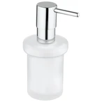Der GROHE Essentials Seifenspender besteht aus Glas und einem verchromten Pumpenkopf.