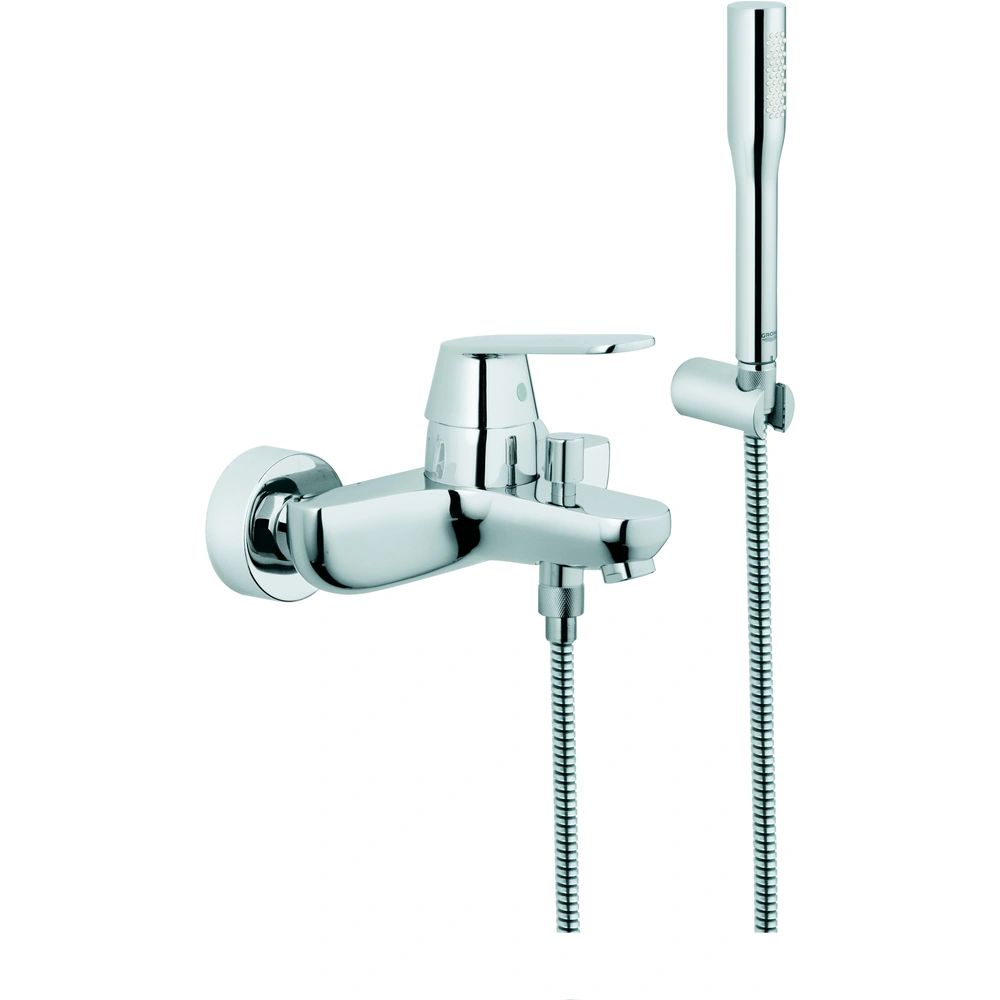 Einhand-Wannenbatterie für die Aufputzmontage mit Handbrausengarnitur. Die Hochdruckarmatur besitzt eine GROHE SilkMove® 46 mm Keramikkartusche, eine variabel einstellbare Mengenbegrenzung, einen Rückflussverhinderer im Brauseabgang 1/2", S-Anschlüsse sowie eine automatische Umstellung von Wanne auf Brause. Die GROHE StarLight® Chromoberfläche ist pflegeleicht, hygienisch und unempfindlich gegen Verkratzen.