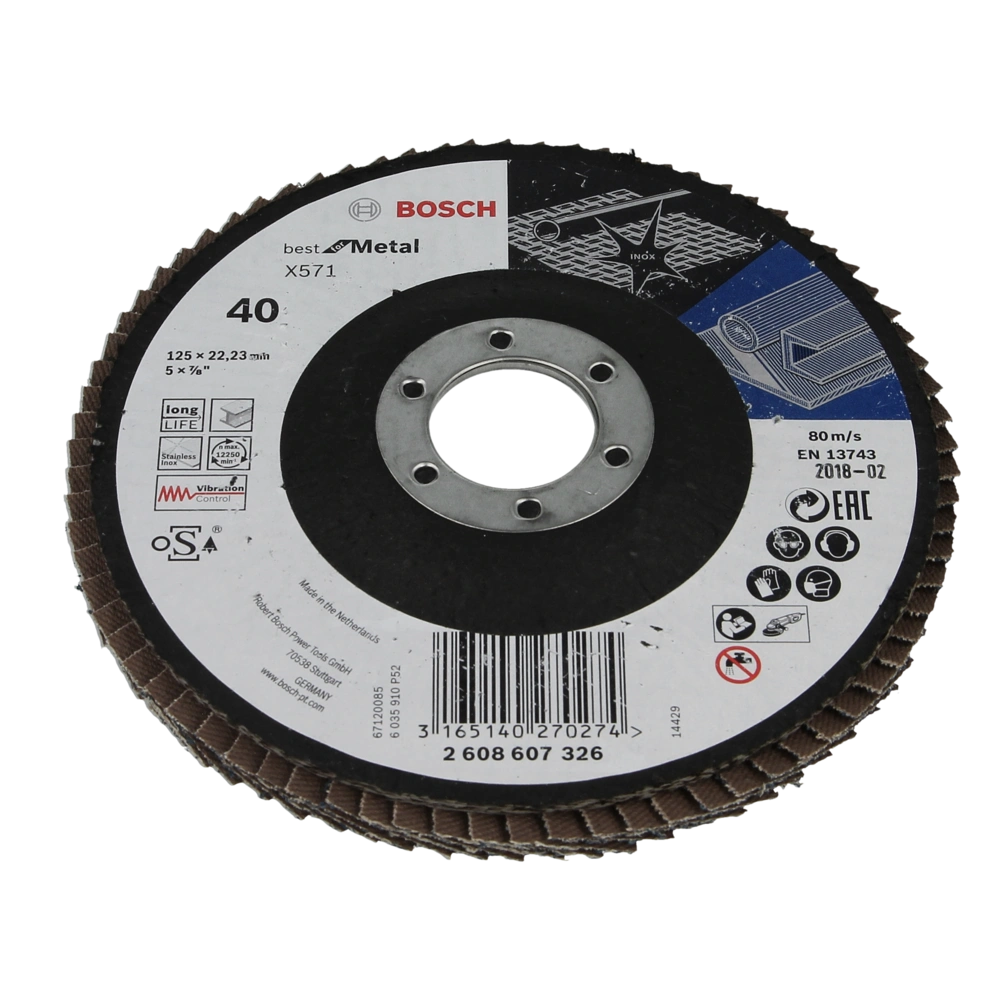 Fächerschleifscheibe in gerader Ausführung für Flächenschliff und Schweißnahtbearbeitung mit Anstellwinkel 5 - 15°. Die robuste und verschleißfeste Scheibe ist für Edelstahl, Stahl, Gusseisen und Stahlblech geeignet.