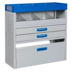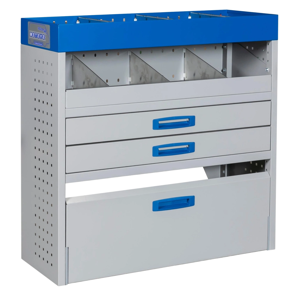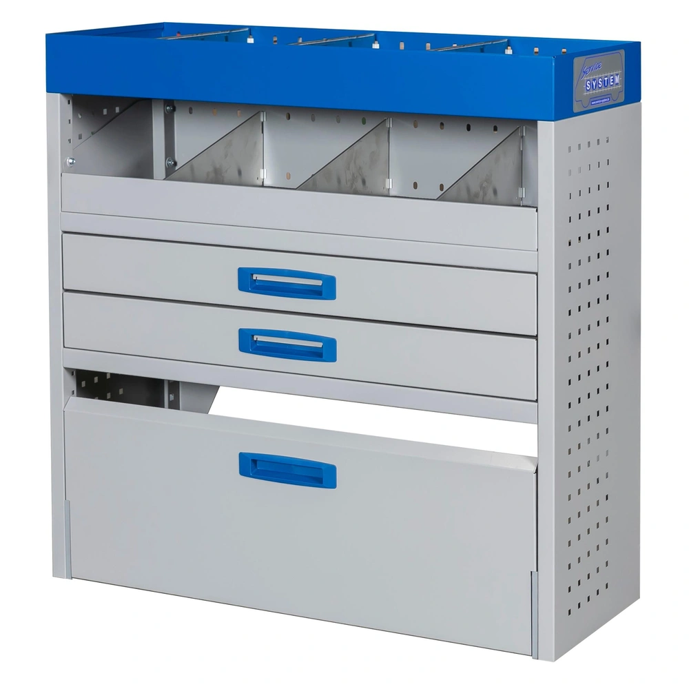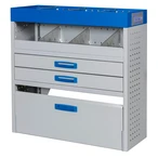 Dieses Modul wurde für den professionellen Fahrzeugeinbau in mittelgroße Transporter der "Bulli"-Klasse entwickelt. Zwei leichtgängige Schubkästen bieten Platz für Werkzeuge oder Zubehör, die unteren Mulden mit Trennblechen und Antirutschmatten sichern Material während der Fahrt. Hinter der Klappe im Sockelbereich steht zusätzlicher Stauraum für größere Teile zur Verfügung. Die durchgehende Aufsatzwanne oben dient als griffbereite Ablagefläche für häufig genutztes Equipment.