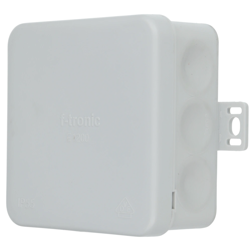 Feuchtraum-Abzweigkasten mit Durchstoßmembrane an allen 4 Seiten und einer rückseitigen Membraneinführung. Der Deckel ist verlustsicher mit dem Gehäuse verbunden.