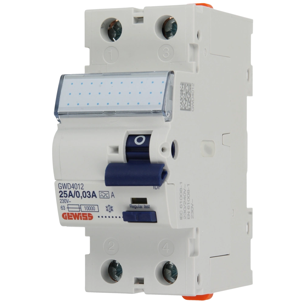 2-poliger Typ A FI-Schutzschalter zur automatischen Abschaltung von Stromkreisen bei Überschreitung des zulässigen Fehlerstroms und zum Schutz vor lebensgefährlichen Situationen durch Isolationsfehler oder gefährliche Berührungsspannung.