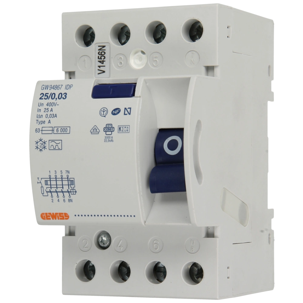 4-poliger Typ A FI-Schutzschalter zur automatischen Abschaltung von Stromkreisen bei Überschreitung des zulässigen Fehlerstroms und zum Schutz vor lebensgefährlichen Situationen durch Isolationsfehler oder gefährliche Berührungsspannung.