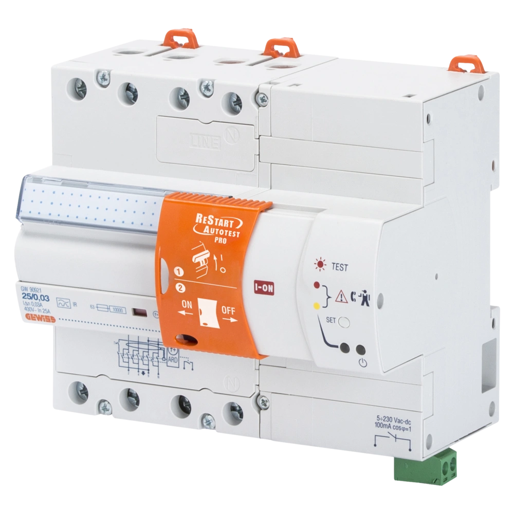 Alle ProduktinformationenIntelligenter Fehlerstrom-Schutzschalter mit automatischem Selbsttest und Neustart ohne Spannungsunterbrechung. Nach auslösen des Fehlerstromschutzschalters wird die Anlage automatisch geprüft und schaltet sich nach erfolgreichem Test von selbst wieder ein.