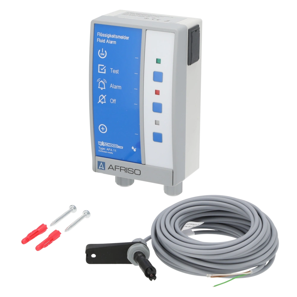 Warngerät zur optischen und akustischen Meldung von Flüssigkeitsansammlungen, die z.B. durch Undichtheiten, Rückstau oder Überflutungen auftreten. Das Gerät ist geeignet für die Medien Heizöl, Dieselkraftstoff, dünnflüssige Schmieröle, Motoren-, Getriebe- oder Hydrauliköle, Pflanzen- und Transformatorenöle, Wasser und andere Flüssigkeiten. Das Set besteht aus einem Signalteil mit optischem und akustischem Alarm, Prüf-/Quittiertaste, Relaisausgang und optoelektronischer Sonde. Die Sonde wird im zu überwachenden Bereich an der tiefsten Stelle montiert. Im Alarmfall wird optischer und akustischer Alarm ausgelöst, er kann mit der Quittiertaste beendet werden. Der optische Alarm bleibt so lange bestehen, bis die Leckage beseitigt ist. Die Prüftaste ermöglicht eine Funktionskontrolle durch Simulieren des Alarmfalles. Über den potenzialfreien Relaiskontakt können zusätzliche externe Signalgeber oder eine Gebäudetechnik angebunden werden.