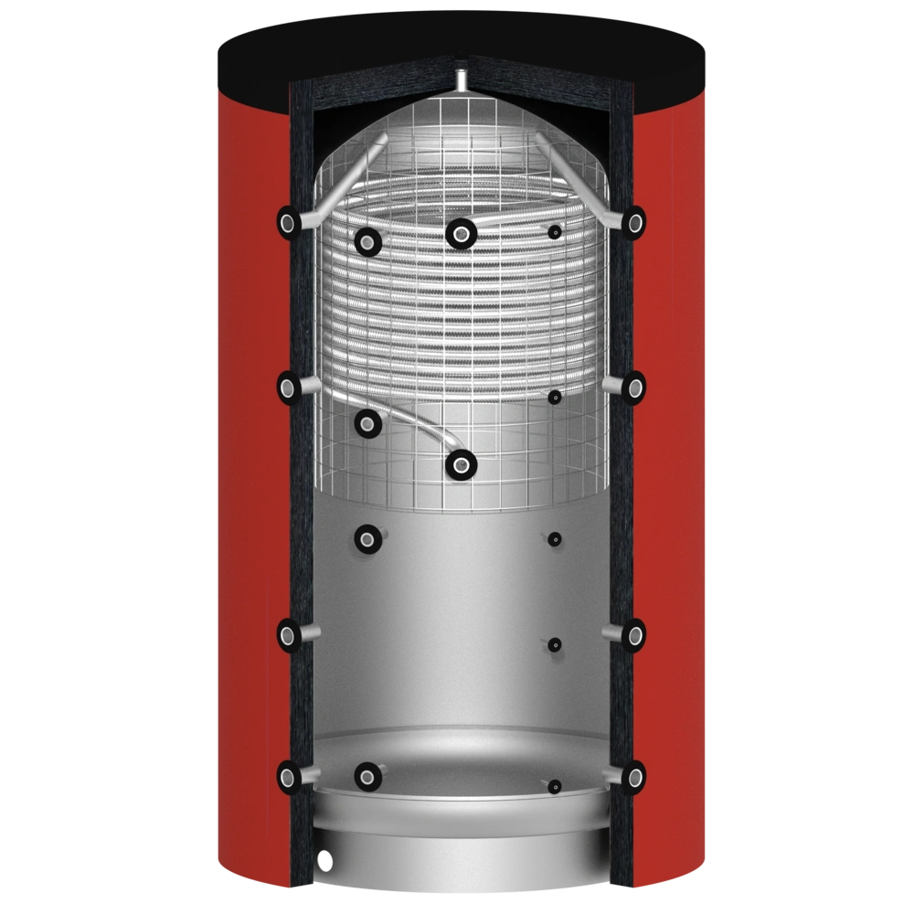 Der Aufbau des Speichers unterscheidet sich grundsätzlich von üblichen, großvolumigen Brauchwasserspeichern. Ein eingebautes Edelstahlwellrohr trennt das Trink- vom Heizwasser und dient gleichzeitig als leistungsstarker Wärmetauscher. Dadurch werden die Vorteile eines Pufferspeichers mit denen eines Durchlauferhitzers kombiniert.