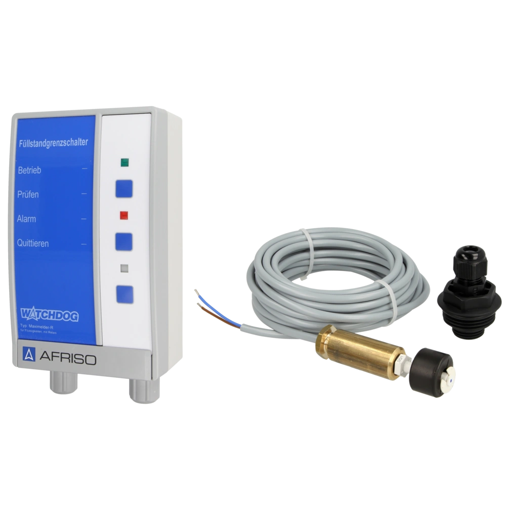 Alle Produktinformationen LieferumfangDer Afriso Melder ist geeignet zur Meldung von Minimalfüllständen in Flüssigkeitsbehältern mit den Medien Wasser, Heizöl EL, L, M, Öl-Wasser-Gemischen und neutralen, nicht dickflüssigen oder anhaftenden Flüssigkeiten. Der Afriso Minimelder besteht aus einem Signalteil und einer höhenverstellbaren Schwimmersonde. Die Sonde wird im unteren Bereich des Behälters montiert und gibt Alarm, wenn der Flüssigkeitspegel soweit absinkt, dass die Sonde aus der Flüssigkeit austaucht. Bei Unterschreitung erfolgt eine optische und akustische Alarmgabe. Das integrierte Relais eignet sich zur Weiterleitung des Ausgangssignals an Zusatzalarmgeräte oder zur Anbindung an Fernmelde- oder Gebäudeleittechnik (GLT).