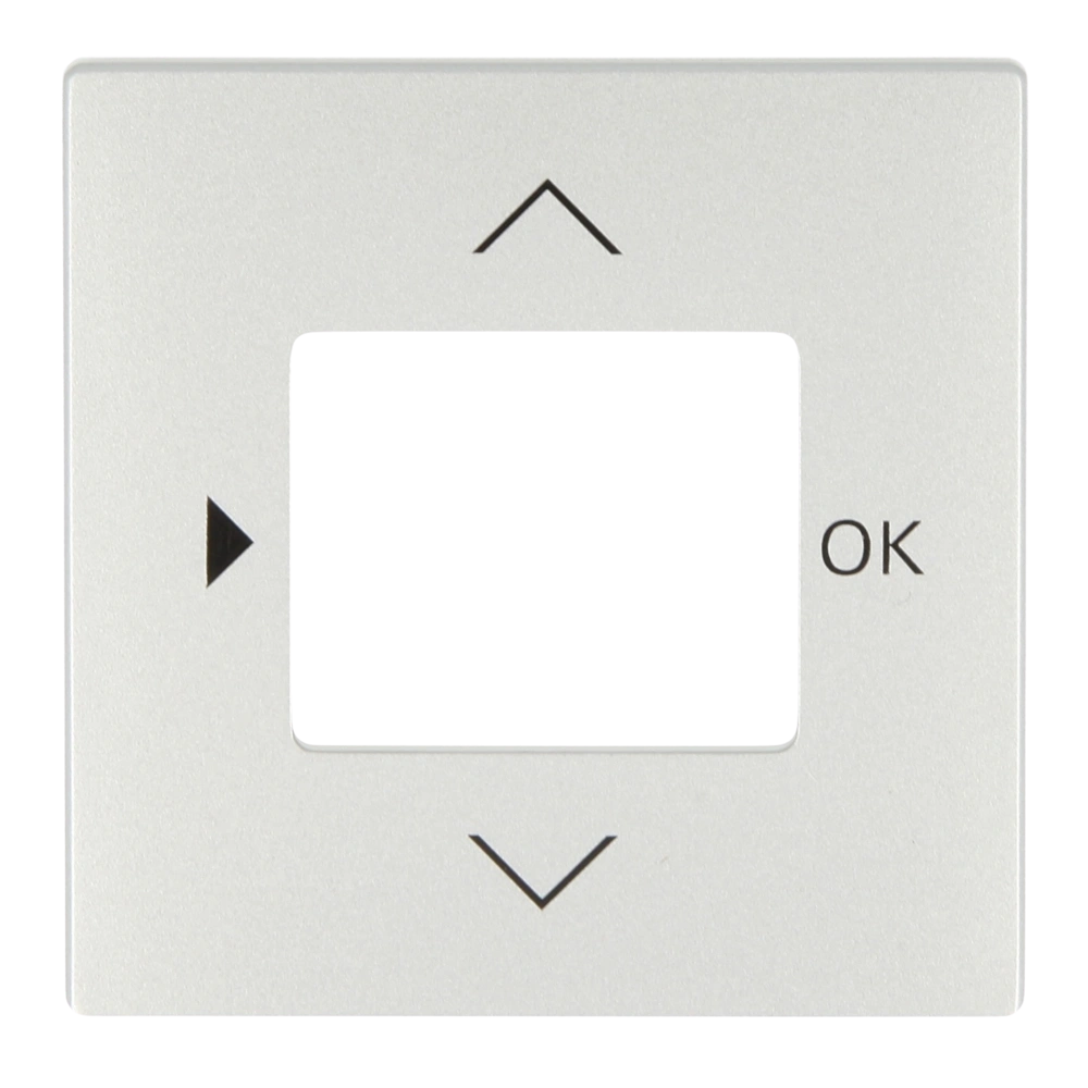 Zentralscheibe mit kleinen Pfeil-Symbolen und Aufdruck "OK" als Abdeckung für Timer-Bedienelemente zur Unterputz-Installation.